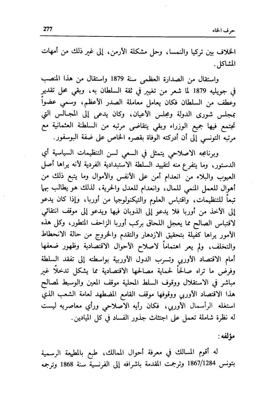 له أقوم المسالك في معرفة أحوال الممالك، طبع بالمطبعة الرسمية بتونس 1284/ 1867 وترجمت المقدمة باشرافه إلى الفرنسية سنة 1868 وترجمه