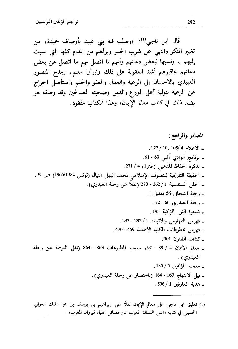 (¬1) تعليق ابن ناجي على معالم الإيمان نقلا عن إبراهيم بن يوسف بن عبد الملك العواني الحسيني في كتابه «انس النساك المعرب عن فضائل علماء قيروان المغرب».