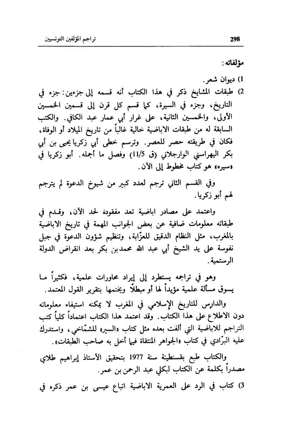 2) طبقات المشايخ ذكر في هذا الكتاب أنه قسمه إلى جزءين: جزء في التاريخ، وجزء في السيرة، كما قسم كل قرن إلى قسمين الخمسين الأولى، والخمسين الثانية، على غرار أبي عمار عبد الكافي. والكتب السابقة له من طبقات الاباضية خالية غالبا من تاريخ الميلاد أو الوفاة، فكان في طريقته حصر للعصر. وترسم خطى أبي زكريا يحيى بن أبي بكر اليهراسني الوارجلاني (ق 5/ 11) وفصل ما أجمله. أبو زكريا في «سيره» هو كتاب مخطوط إلى الآن.