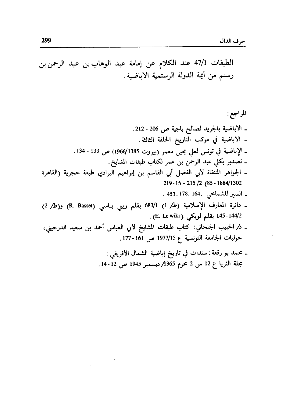 الطبقات 1/ 47 عند الكلام عن إمامة عبد الوهاب بن عبد الرحمن بن رستم من أيمة الدولة الرستمية الاباضية.