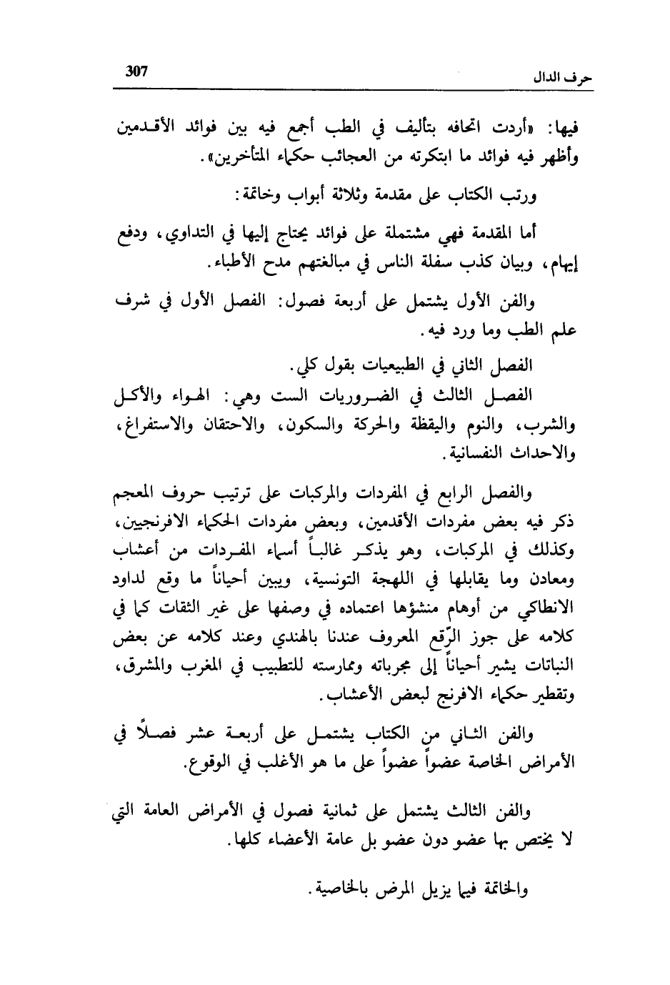 والفصل الرابع في المفردات والمركبات على ترتيب حروف المعجم ذكر فيه بعض مفردات الأقدمين، وبعض مفردات الحكماء الافرنجيين، وكذلك في المركبات، وهو يذكر غالبا أسماء المفردات من أعشاب ومعادن وما يقابلها في اللهجة التونسية، ويبين أحيانا ما وقع لداود الانطاكي من أوهام منشؤها اعتماده في وصفها على غير الثقات كما في كلامه على جوز الرّقع المعروف عندنا بالهندي وعند كلامه عن بعض النباتات يشير أحيانا إلى مجرباته وممارسته للتطبيب في المغرب والمشرق، وتقطير حكماء الافرنج لبعض الأعشاب.