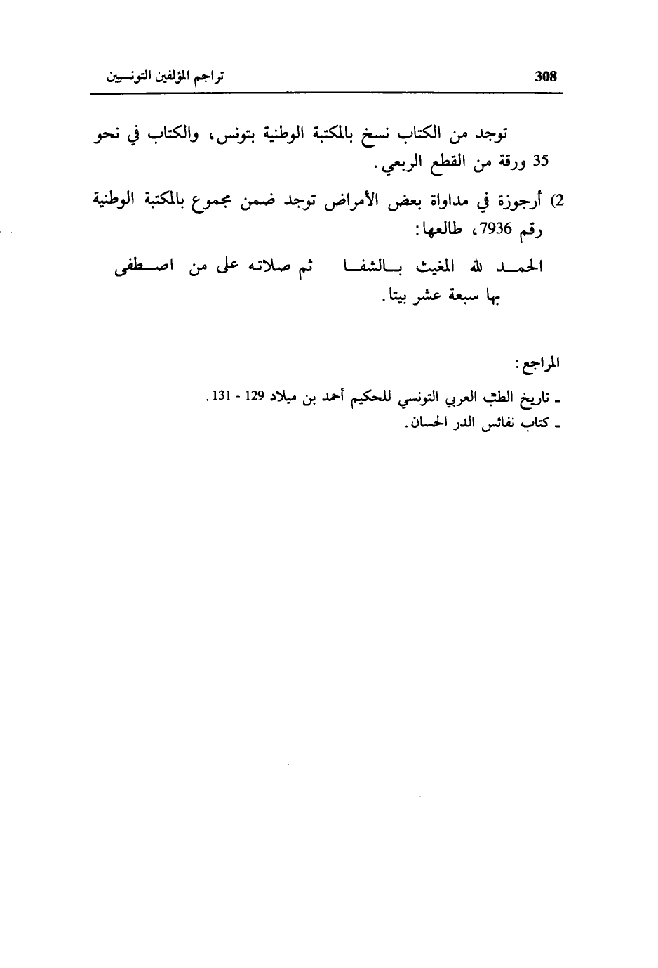 2) أرجوزة في مداواة بعض الأمراض توجد ضمن مجموع بالمكتبة الوطنية رقم 7936، طالعها:
