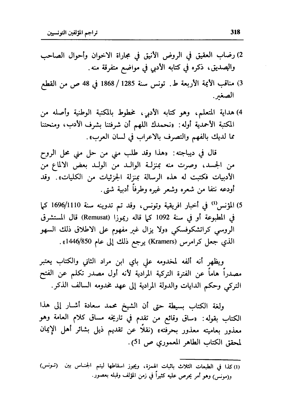 5) المؤنس (¬1) في أخبار افريقية وتونس، وقد تم تدوينه سنة 1110/ 1696 كما في المطبوعة أو في سنة 1092 كما قاله ريموزا (Remusat) قال المستشرق الروسي كراتشكوفسكي «ولا يزال غير مفهوم على الاطلاق ذلك السهو الذي جعل كرامرس (Kramers) يرجع ذلك إلى عام 850/ 1446».