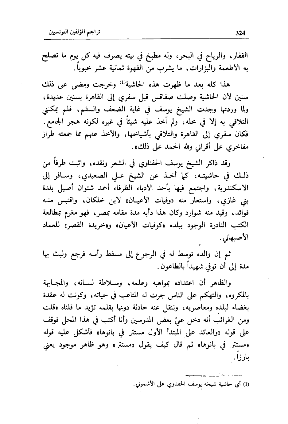 هذا كله بعد ما ظهرت هذه الحاشية (¬1) وخرجت ومضى على ذلك سنين لأن الحاشية وصلت صفاقس قبل سفري إلى القاهرة بسنين عديدة، ولما وردتها وجدت الشيخ يوسف في غاية الضعف والسقم، فلم يمكنني التلاقي به إلا في محله، ولم آخذ عليه شيئا في غيره لكونه هجر الجامع.