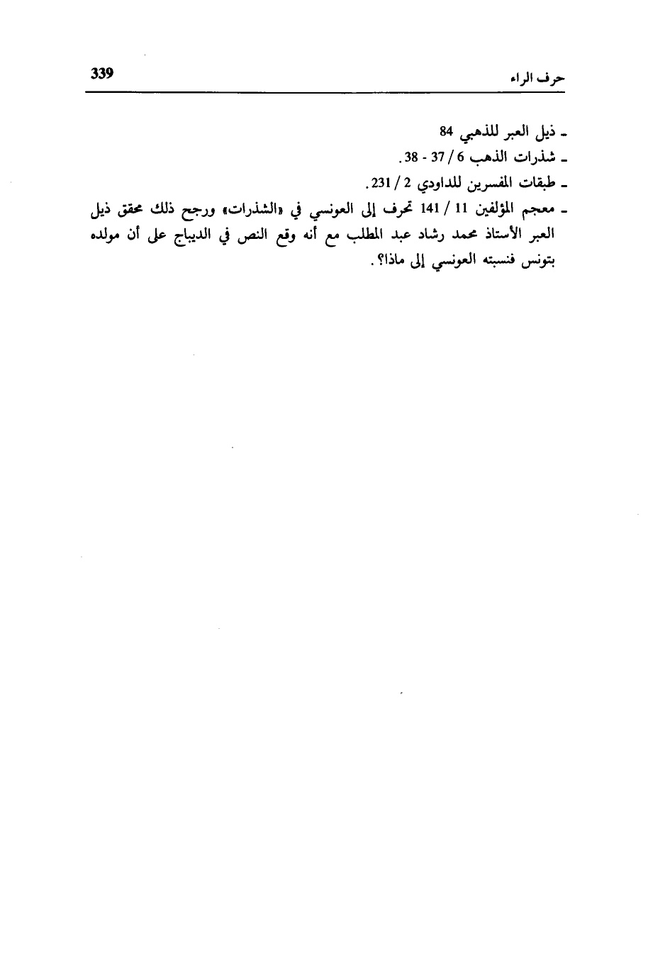 - معجم المؤلفين 11/ 141 تحرف إلى العونسي في «الشذرات» ورجح ذلك محقق ذيل العبر الأستاذ محمد رشاد عبد المطلب مع أنه وقع النص في الديباج على أن مولده بتونس فنسبته العونسي إلى ماذا؟ .