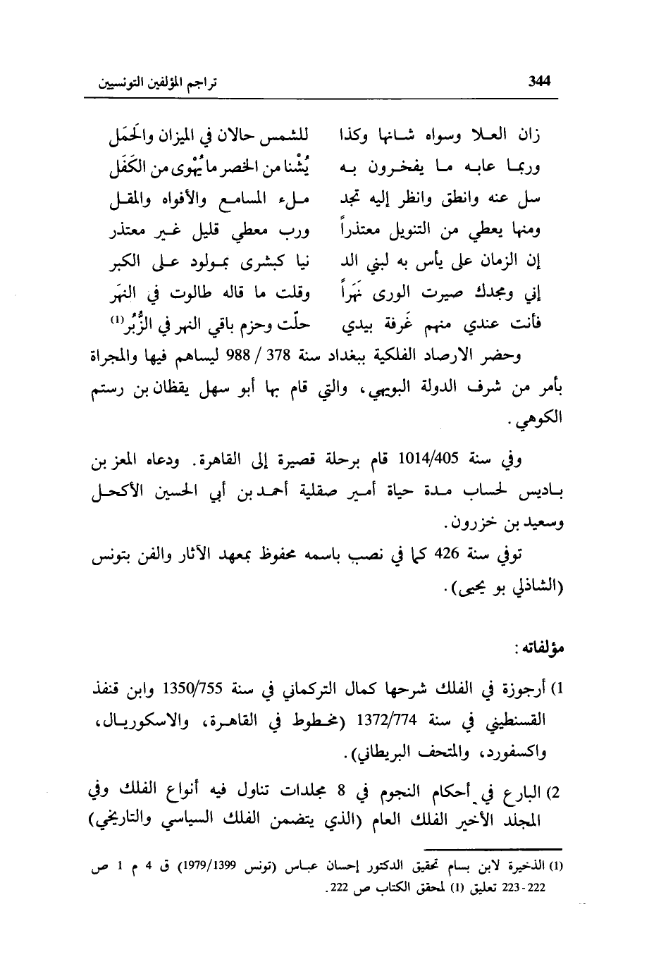 1) أرجوزة في الفلك شرحها كمال التركماني في سنة 755/ 1350 وابن قنفذ القسنطيني في سنة 774/ 1372 (مخطوط في القاهرة، والاسكوريال، واكسفورد، والمتحف البريطاني).
