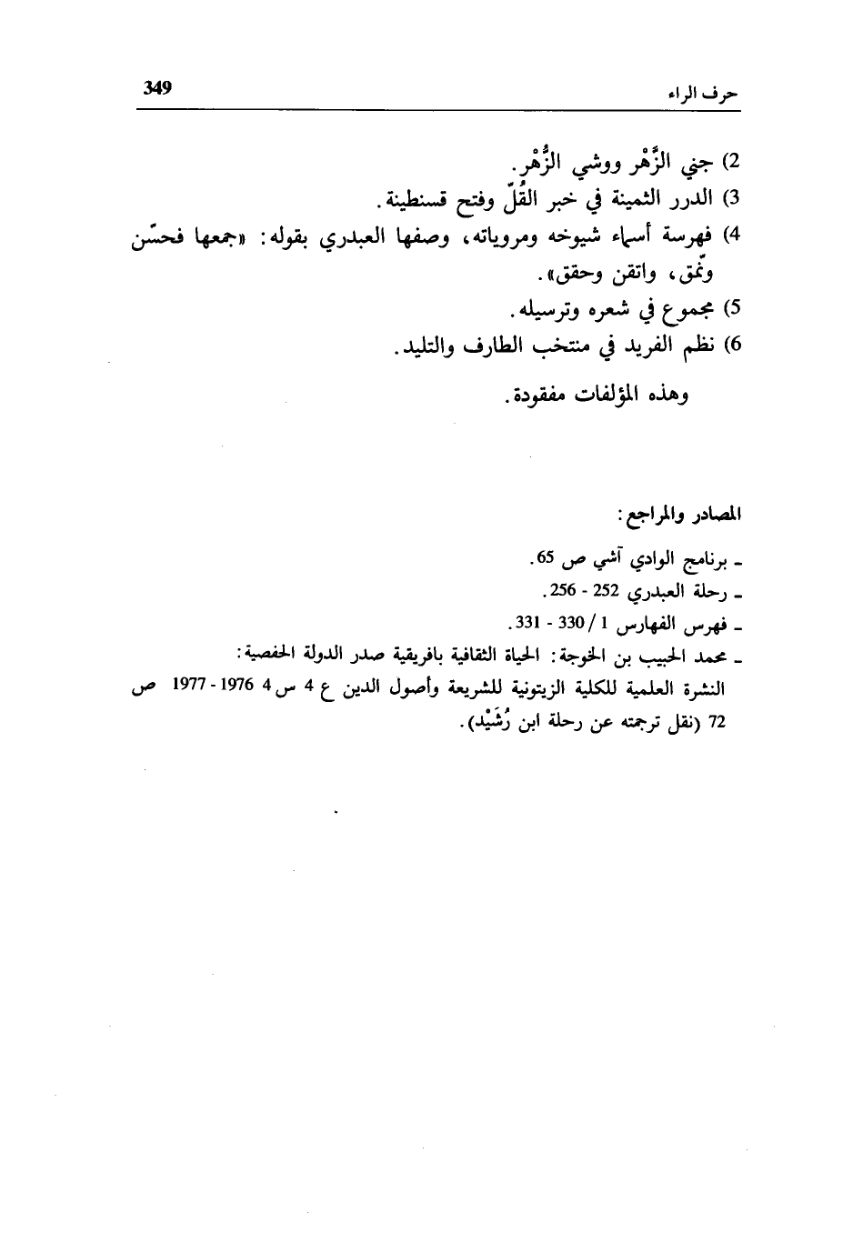 النشرة العلمية للكلية الزيتونية للشريعة وأصول الدين ع 4 س 4، 1976 - 1977 ص 72 (نقل ترجمته عن رحلة ابن رشيد).