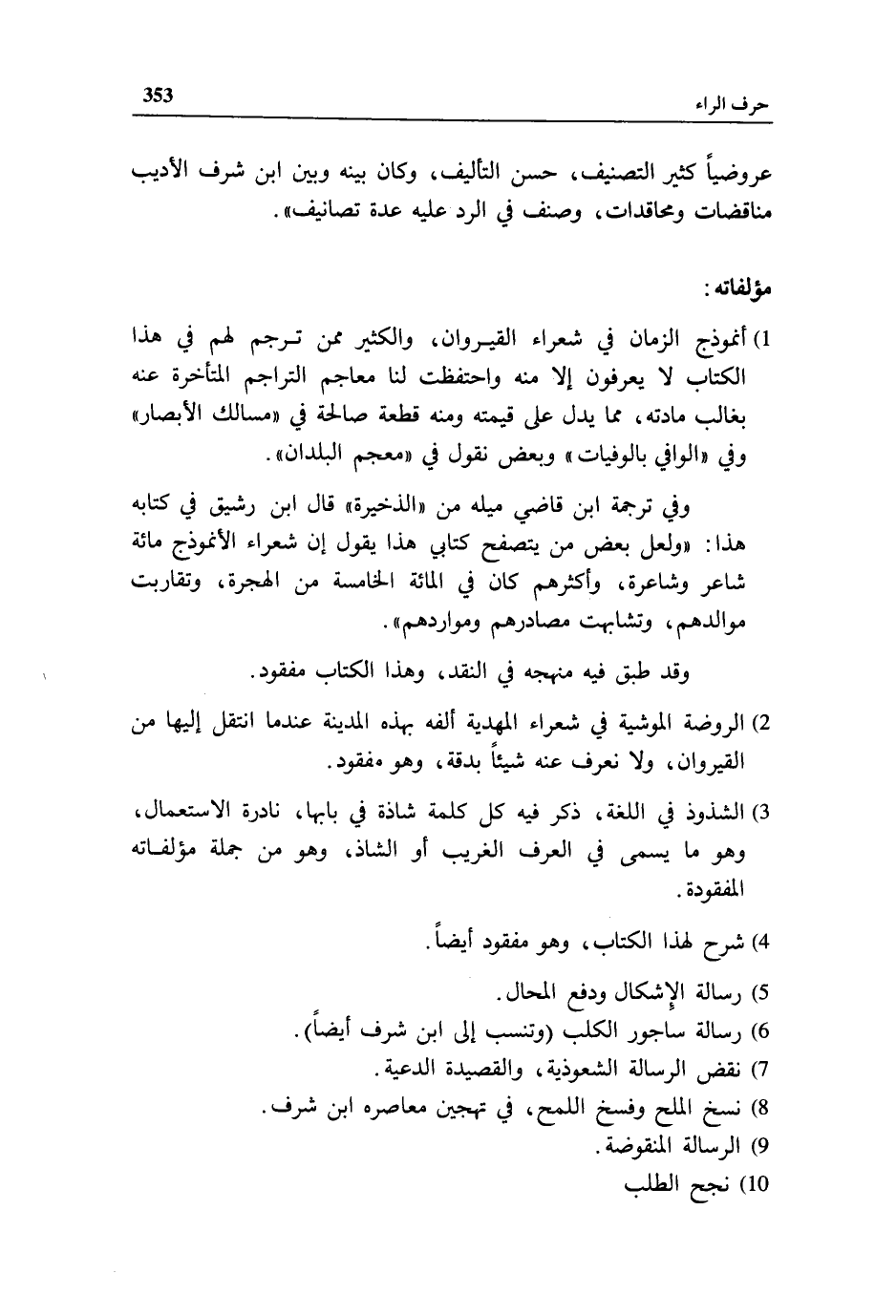 1) أنموذج الزمان في شعراء القيروان، والكثير ممن ترجم لهم في هذا الكتاب لا يعرفون إلا منه واحتفظت لنا معاجم التراجم المتأخرة عنه بغالب مادته، مما يدل على قيمته ومنه قطعة صالحة في «مسالك الأبصار» وفي «الوافي بالوفيات» وبعض نقول في «معجم البلدان».