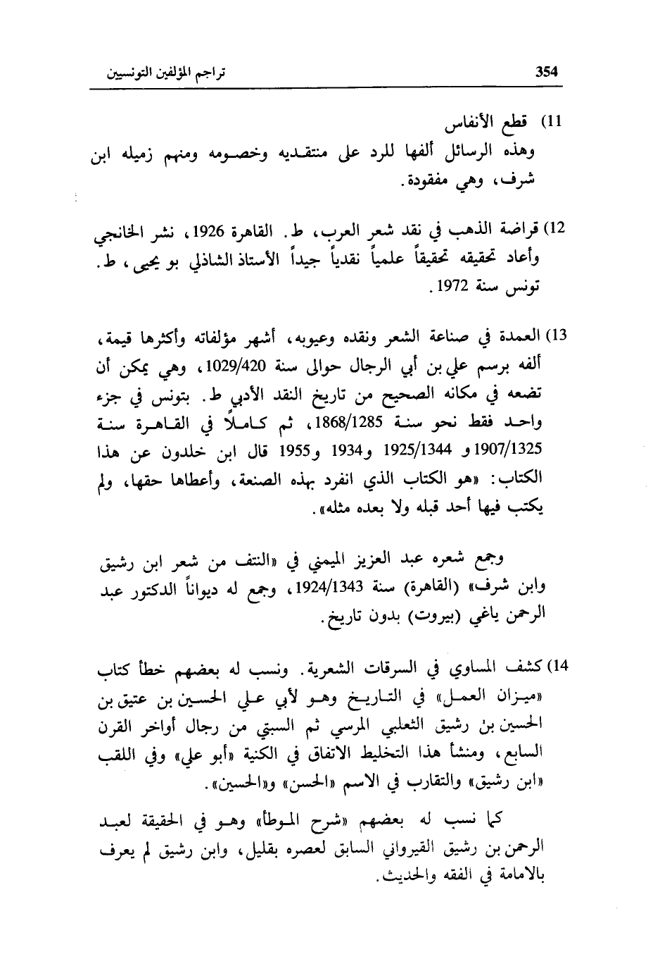 13) العمدة في صناعة الشعر ونقده وعيوبه، أشهر مؤلفاته وأكثرها قيمة، ألفه برسم علي بن أبي الرجال حوالى سنة 420/ 1029، وهي يمكن أن تضعه في مكانه الصحيح من تاريخ النقد الأدبي ط. بتونس في جزء واحد فقط نحو سنة 1285/ 1868، ثم كاملا في القاهرة سنة 1325/ 1907 و 1344/ 1925 و 1934 و 1955 قال ابن خلدون عن هذا الكتاب: «هو الكتاب الذي انفرد بهذه الصنعة، وأعطاها حقها، ولم يكتب فيها أحد قبله ولا بعده مثله».