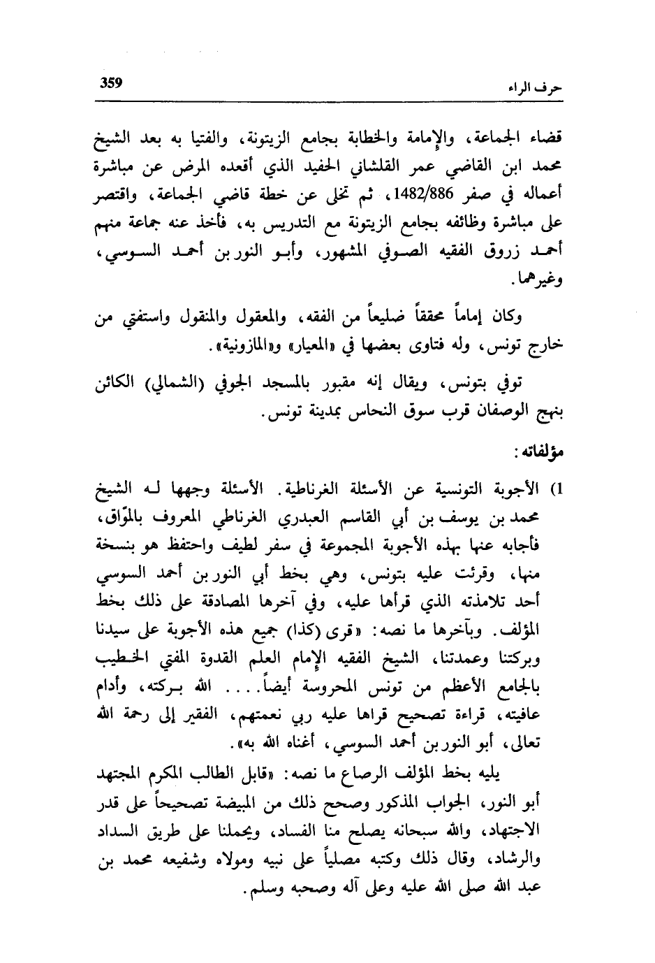 وكان إماما محققا ضليعا من الفقه، والمعقول والمنقول واستفتي من خارج تونس، وله فتاوى بعضها في «المعيار» و «المازونية».