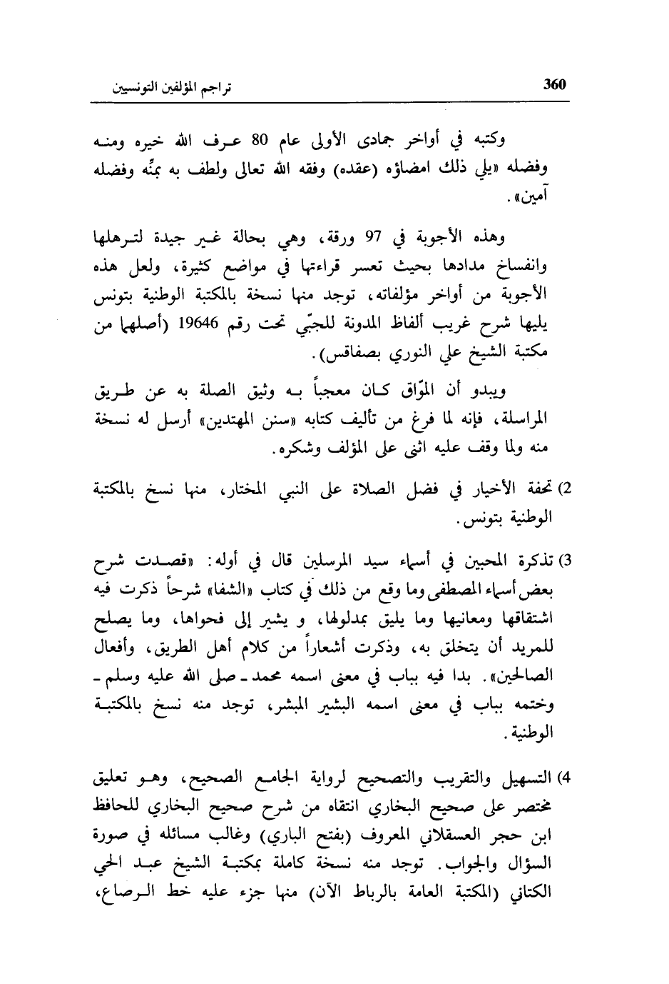 2) تحفة الأخيار في فضل الصلاة على النبي المختار، منها نسخ بالمكتبة الوطنية بتونس.
