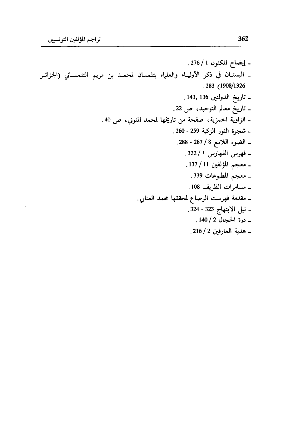 - البستان في ذكر الأولياء والعلماء بتلمسان لمحمد بن مريم التلمساني (الجزائر 1326/ 1908) 283.
