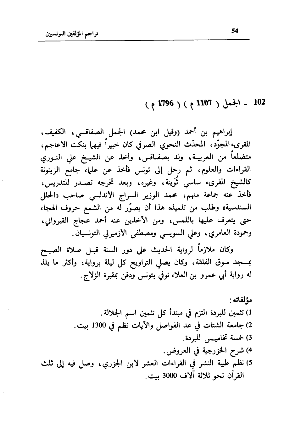 إبراهيم بن أحمد (وقيل ابن محمد) الجمل الصفاقسي، الكفيف، المقرئ المجوّد، المحدّث النحوي الصرفي كان خبيرا فيهما بنكت الاعاجم، متضلعا من العربية، ولد بصفاقس، وأخذ عن الشيخ علي النوري القراءات والعلوم، ثم رحل إلى تونس فأخذ عن علماء جامع الزيتونة كالشيخ المقرئ ساسي ثوينة، وغيره، وبعد تخرجه تصدر للتدريس، فأخذ عنه جماعة منهم، محمد الوزير السراج الأندلسي صاحب «الحلل السندسية» وطلب من تلميذه هذا أن يصوّر له من الشمع حروف الهجاء حتى يتعرف عليها باللمس، ومن الآخذين عنه أحمد عجاج القيرواني، وحمودة العامري، وعلي السويسي ومصطفى الأزميرلي التونسيان.
