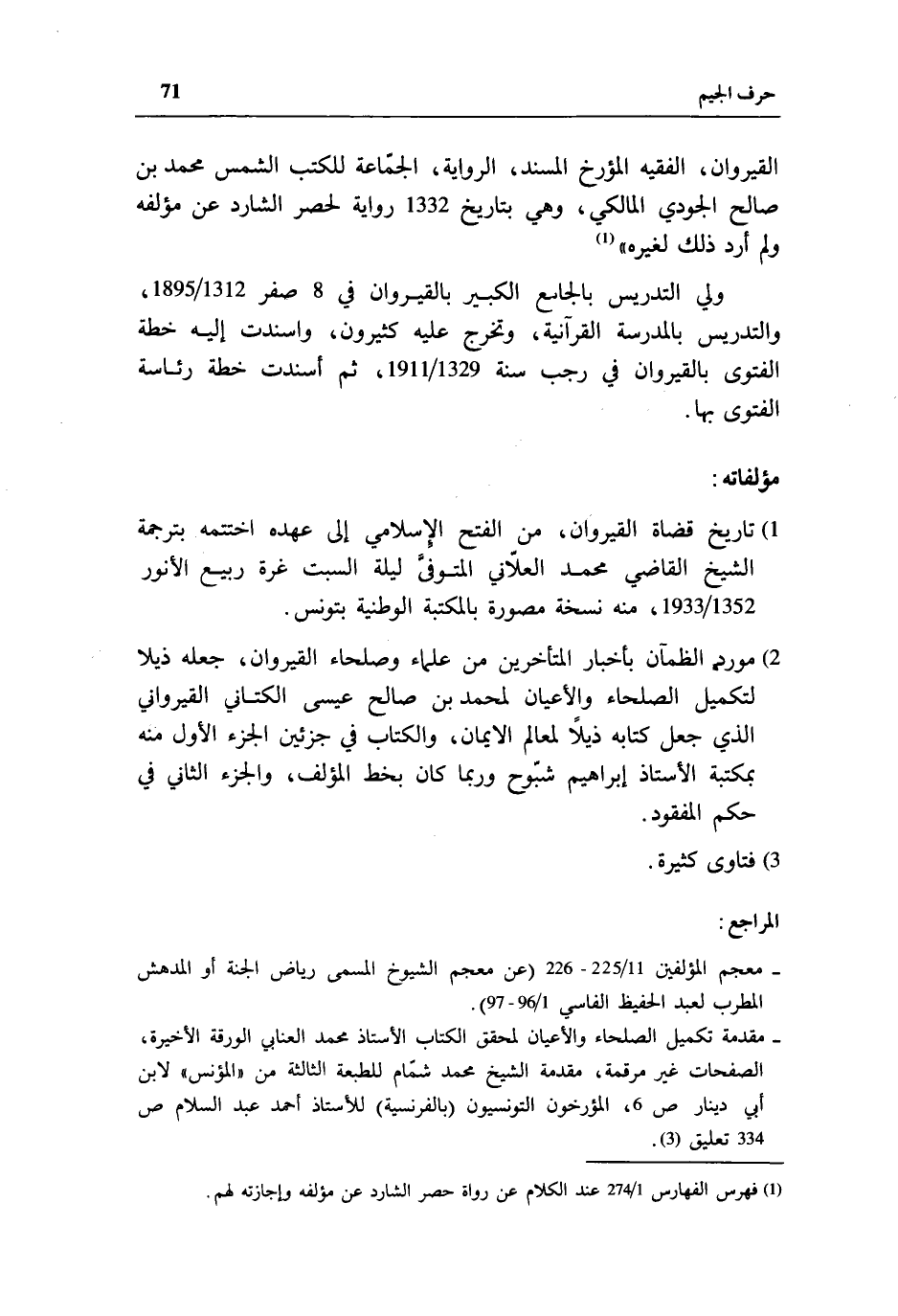 القيروان، الفقيه المؤرخ المسند، الرواية، الجمّاعة للكتب الشمس محمد بن صالح الجودي المالكي، وهي بتاريخ 1332 رواية لحصر الشارد عن مؤلفه ولم أرد ذلك لغيره» (¬1)