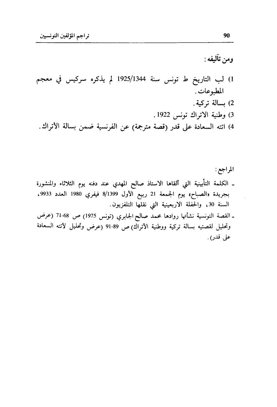 - القصة التونسية نشأتها روادها محمد صالح الجابري (تونس 1975) ص 68 - 71 (عرض وتحليل لقصتيه بسالة تركية ووطنية الأتراك) ص 89 - 91 (عرض وتحليل لأتته السعادة على قدر).
