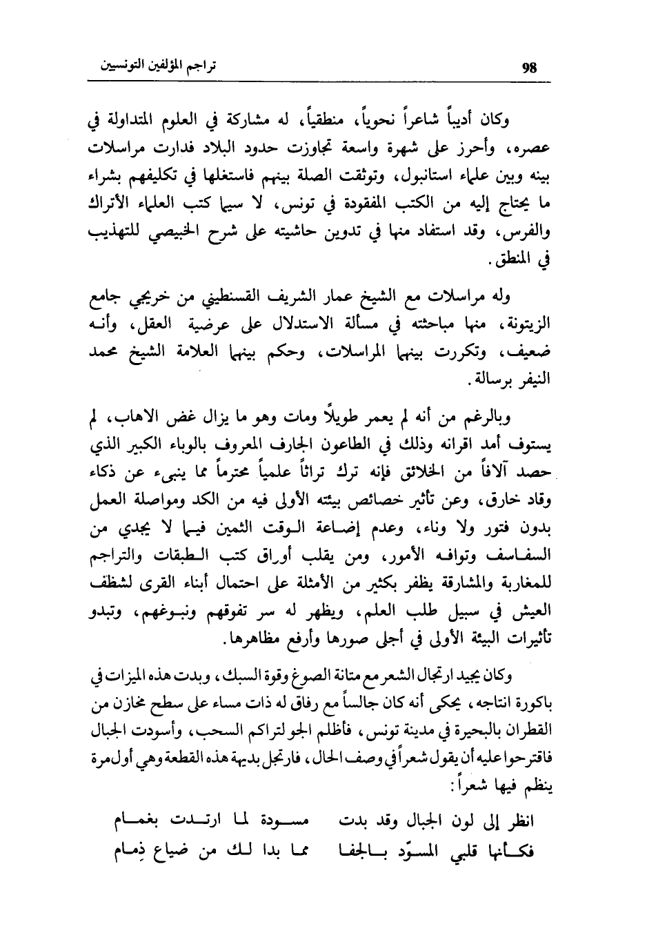 وكان أديبا شاعرا نحويا، منطقيا، له مشاركة في العلوم المتداولة في عصره، وأحرز على شهرة واسعة تجاوزت حدود البلاد فدارت مراسلات بينه وبين علماء استانبول، وتوثقت الصلة بينهم فاستغلها في تكليفهم بشراء ما يحتاج إليه من الكتب المفقودة في تونس، لا سيما كتب العلماء الأتراك والفرس، وقد استفاد منها في تدوين حاشيته على شرح الخبيصي للتهذيب في المنطق.