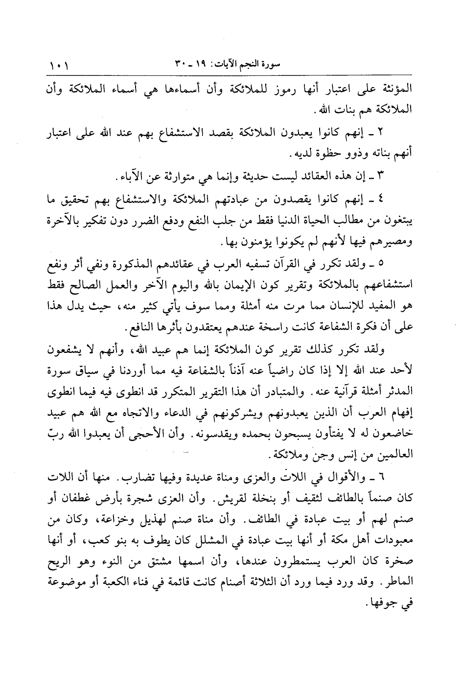 ولقد تكرر كذلك تقرير كون الملائكة إنما هم عبيد الله، وأنهم لا يشفعون لأحد عند الله إلا إذا كان راضيا عنه آذنا بالشفاعة فيه مما أوردنا في سياق سورة المدثر أمثلة قرآنية عنه. والمتبادر أن هذا التقرير المتكرر قد انطوى فيه فيما انطوى إفهام العرب أن الذين يعبدونهم ويشركونهم في الدعاء والاتجاه مع الله هم عبيد خاضعون له لا يفتأون يسبحون بحمده ويقدسونه. وأن الأحجى أن يعبدوا الله ربّ العالمين من إنس وجن وملائكة.