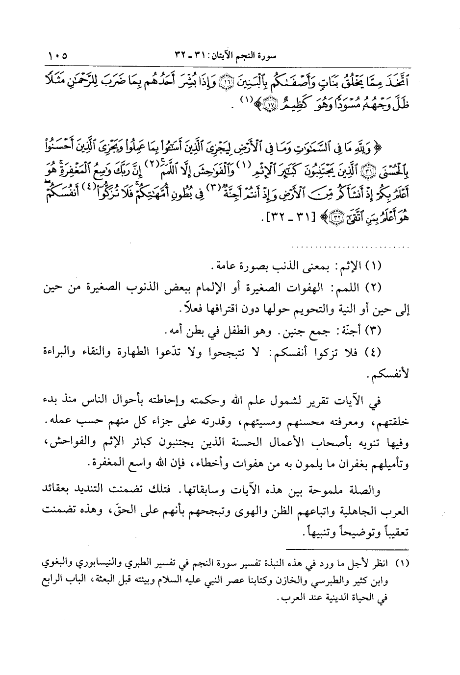 وَلِلَّهِ ما فِي السَّماواتِ وَما فِي الْأَرْضِ لِيَجْزِيَ الَّذِينَ أَساؤُا بِما عَمِلُوا وَيَجْزِيَ الَّذِينَ أَحْسَنُوا بِالْحُسْنَى (31) الَّذِينَ يَجْتَنِبُونَ كَبائِرَ الْإِثْمِ (1) وَالْفَواحِشَ إِلَّا اللَّمَمَ (2) إِنَّ رَبَّكَ واسِعُ الْمَغْفِرَةِ هُوَ أَعْلَمُ بِكُمْ إِذْ أَنْشَأَكُمْ مِنَ الْأَرْضِ وَإِذْ أَنْتُمْ أَجِنَّةٌ (3) فِي بُطُونِ أُمَّهاتِكُمْ فَلا تُزَكُّوا (4) أَنْفُسَكُمْ هُوَ أَعْلَمُ بِمَنِ اتَّقى (32) [31- 32] .
