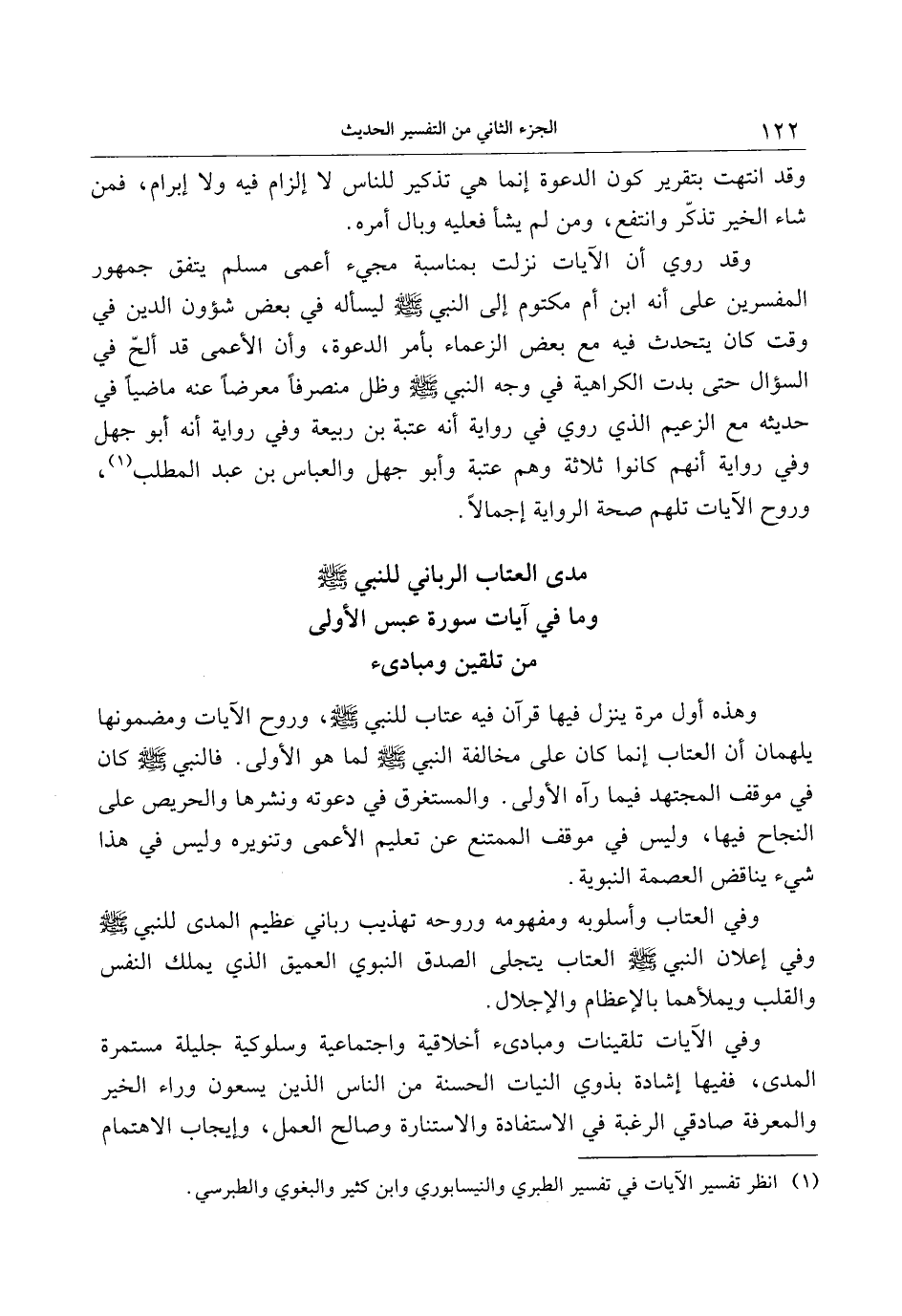 وهذه أول مرة ينزل فيها قرآن فيه عتاب للنبي صلّى الله عليه وسلّم، وروح الآيات ومضمونها يلهمان أن العتاب إنما كان على مخالفة النبي صلّى الله عليه وسلّم لما هو الأولى. فالنبي صلّى الله عليه وسلّم كان في موقف المجتهد فيما رآه الأولى. والمستغرق في دعوته ونشرها والحريص على النجاح فيها، وليس في موقف الممتنع عن تعليم الأعمى وتنويره وليس في هذا شيء يناقض العصمة النبوية.