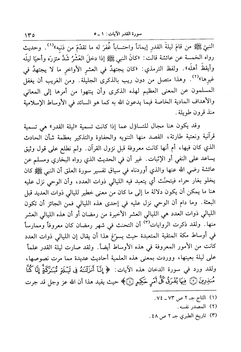 وقد يكون هنا مجال للتساؤل عما إذا كانت تسمية «ليلة القدر» هي تسمية قرآنية ونعتية طارئة، القصد منها التنويه والحفاوة والتذكير بعظمة شأن الحادث الذي كان فيها، أم أنها كانت معروفة قبل نزول القرآن. ولم نطلع على قول وثيق يساعد على النفي أو الإثبات. غير أن في الحديث الذي رواه البخاري ومسلم عن عائشة رضي الله عنها والذي أوردناه في سياق تفسير سورة العلق أن النبي صلّى الله عليه وسلّم كان يخلو بغار حراء فيتحنّث أي يتعبد فيه الليالي ذوات العدد، وأن الوحي نزل عليه هنا ما يمكن أن يكون دلالة ما إلى ما كان من معنى خطير لليالي ذوات العديد قبل البعثة. وما دام أن الوحي نزل عليه في إحدى هذه الليالي فمن الجائز أن تكون الليالي ذوات العدد هي الليالي العشر الأخيرة من رمضان أو أن هذه الليالي العشر منها. ولقد ذكرت الروايات «3» أن التحنث في شهر رمضان كان معروفا وممارسا في أوساط مكة المتقية المتعبدة حيث يسوّغ هذا أن يقال إن الليالي ذوات العدد كانت من الأمور المعروفة في هذه الأوساط أيضا. ولقد صارت ليلة القدر علما على ليلة بعينها، ووردت بمعنى هذه العلمية أحاديث عديدة مما مرت نصوصها، ولقد ورد في سورة الدخان هذه الآيات: إِنَّا أَنْزَلْناهُ فِي لَيْلَةٍ مُبارَكَةٍ إِنَّا كُنَّا مُنْذِرِينَ (3) فِيها يُفْرَقُ كُلُّ أَمْرٍ حَكِيمٍ (4) حيث يفيد هذا أن الله عز وجل قد جرت
