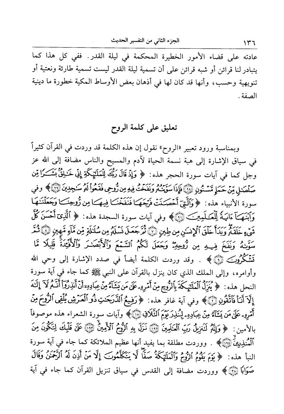 وبمناسبة ورود تعبير «الروح» نقول إن هذه الكلمة قد وردت في القرآن كثير في سياق الإشارة إلى هبة نسمة الحياة لآدم والمسيح والناس مضافة إلى الله عز وجل كما في آيات سورة الحجر هذه: وَإِذْ قالَ رَبُّكَ لِلْمَلائِكَةِ إِنِّي خالِقٌ بَشَراً مِنْ صَلْصالٍ مِنْ حَمَإٍ مَسْنُونٍ (28) فَإِذا سَوَّيْتُهُ وَنَفَخْتُ فِيهِ مِنْ رُوحِي فَقَعُوا لَهُ ساجِدِينَ (29) وفي سورة الأنبياء هذه: وَالَّتِي أَحْصَنَتْ فَرْجَها فَنَفَخْنا فِيها مِنْ رُوحِنا وَجَعَلْناها وَابْنَها آيَةً لِلْعالَمِينَ (91) وفي آيات سورة السجدة هذه: الَّذِي أَحْسَنَ كُلَّ شَيْءٍ خَلَقَهُ وَبَدَأَ خَلْقَ الْإِنْسانِ مِنْ طِينٍ (7) ثُمَّ جَعَلَ نَسْلَهُ مِنْ سُلالَةٍ مِنْ ماءٍ مَهِينٍ (8) ثُمَّ سَوَّاهُ وَنَفَخَ فِيهِ مِنْ رُوحِهِ وَجَعَلَ لَكُمُ السَّمْعَ وَالْأَبْصارَ وَالْأَفْئِدَةَ قَلِيلًا ما تَشْكُرُونَ (9) . وقد وردت الكلمة أيضا في صدد الإشارة إلى وحي الله وأوامره، وإلى الملك الذي كان ينزل بالقرآن على النبي صلّى الله عليه وسلّم كما جاء في آية سورة النحل هذه: يُنَزِّلُ الْمَلائِكَةَ بِالرُّوحِ مِنْ أَمْرِهِ عَلى مَنْ يَشاءُ مِنْ عِبادِهِ أَنْ أَنْذِرُوا أَنَّهُ لا إِلهَ إِلَّا أَنَا فَاتَّقُونِ (2) وفي آية غافر هذه: رَفِيعُ الدَّرَجاتِ ذُو الْعَرْشِ يُلْقِي الرُّوحَ مِنْ أَمْرِهِ عَلى مَنْ يَشاءُ مِنْ عِبادِهِ لِيُنْذِرَ يَوْمَ التَّلاقِ (15) وآيات سورة الشعراء هذه موصوفا بالأمين: وَإِنَّهُ لَتَنْزِيلُ رَبِّ الْعالَمِينَ (192) نَزَلَ بِهِ الرُّوحُ الْأَمِينُ (193) عَلى قَلْبِكَ لِتَكُونَ مِنَ الْمُنْذِرِينَ (194) . ووردت مطلقة بما يفيد أنها عظيم الملائكة كما جاء في آية سورة النبأ هذه: يَوْمَ يَقُومُ الرُّوحُ وَالْمَلائِكَةُ صَفًّا لا يَتَكَلَّمُونَ إِلَّا مَنْ أَذِنَ لَهُ الرَّحْمنُ وَقالَ صَواباً (38) ووردت مضافة إلى القدس في سياق تنزيل القرآن كما جاء في آية