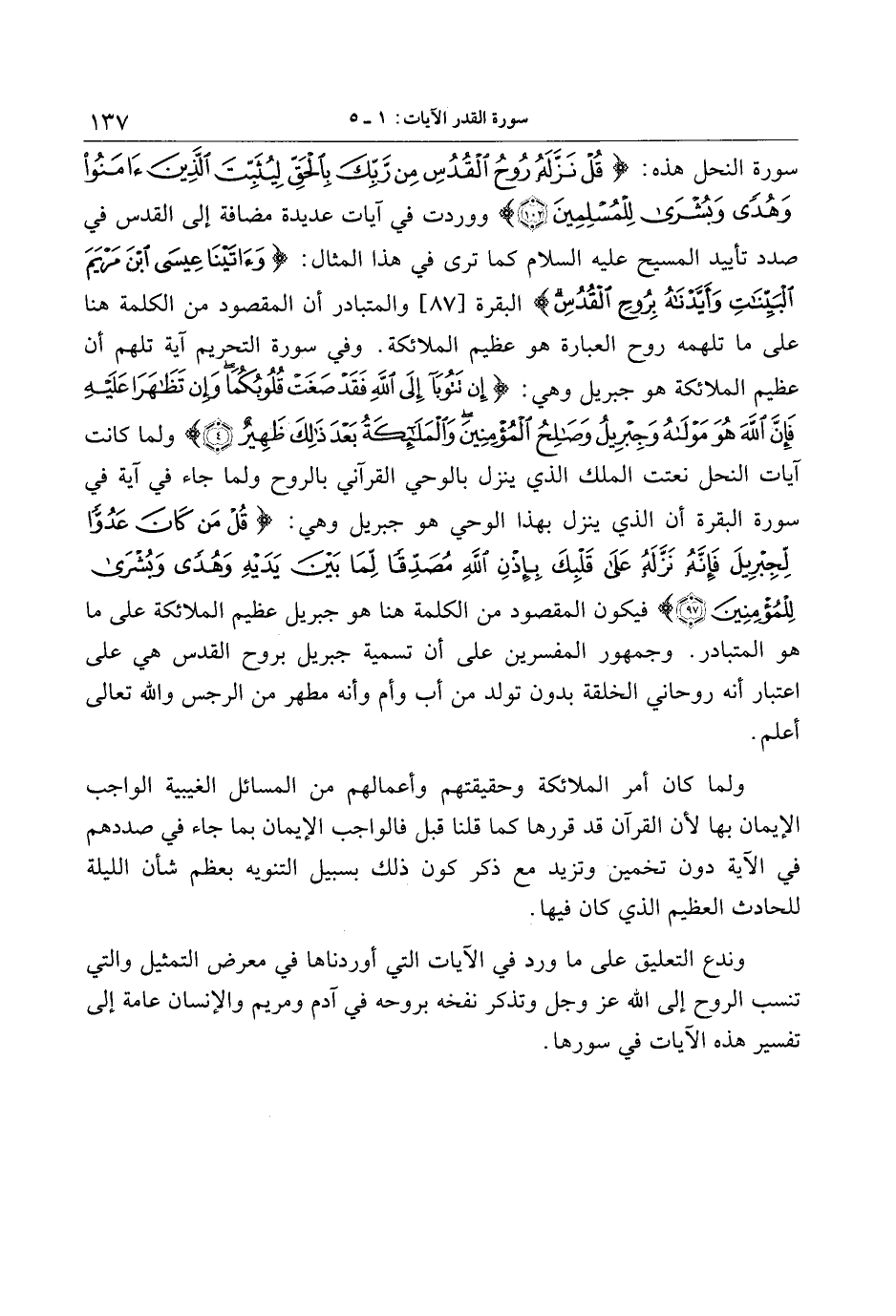 سورة النحل هذه: قُلْ نَزَّلَهُ رُوحُ الْقُدُسِ مِنْ رَبِّكَ بِالْحَقِّ لِيُثَبِّتَ الَّذِينَ آمَنُوا وَهُدىً وَبُشْرى لِلْمُسْلِمِينَ (102) ووردت في آيات عديدة مضافة إلى القدس في صدد تأييد المسيح عليه السلام كما ترى في هذا المثال: وَآتَيْنا عِيسَى ابْنَ مَرْيَمَ الْبَيِّناتِ وَأَيَّدْناهُ بِرُوحِ الْقُدُسِ البقرة [87] والمتبادر أن المقصود من الكلمة هنا على ما تلهمه روح العبارة هو عظيم الملائكة. وفي سورة التحريم آية تلهم أن عظيم الملائكة هو جبريل وهي: إِنْ تَتُوبا إِلَى اللَّهِ فَقَدْ صَغَتْ قُلُوبُكُما وَإِنْ تَظاهَرا عَلَيْهِ فَإِنَّ اللَّهَ هُوَ مَوْلاهُ وَجِبْرِيلُ وَصالِحُ الْمُؤْمِنِينَ وَالْمَلائِكَةُ بَعْدَ ذلِكَ ظَهِيرٌ (4) ولما كانت آيات النحل نعتت الملك الذي ينزل بالوحي القرآني بالروح ولما جاء في آية في سورة البقرة أن الذي ينزل بهذا الوحي هو جبريل وهي: قُلْ مَنْ كانَ عَدُوًّا لِجِبْرِيلَ فَإِنَّهُ نَزَّلَهُ عَلى قَلْبِكَ بِإِذْنِ اللَّهِ مُصَدِّقاً لِما بَيْنَ يَدَيْهِ وَهُدىً وَبُشْرى لِلْمُؤْمِنِينَ (97) فيكون المقصود من الكلمة هنا هو جبريل عظيم الملائكة على ما هو المتبادر. وجمهور المفسرين على أن تسمية جبريل بروح القدس هي على اعتبار أنه روحاني الخلقة بدون تولد من أب وأم وأنه مطهر من الرجس والله تعالى أعلم.