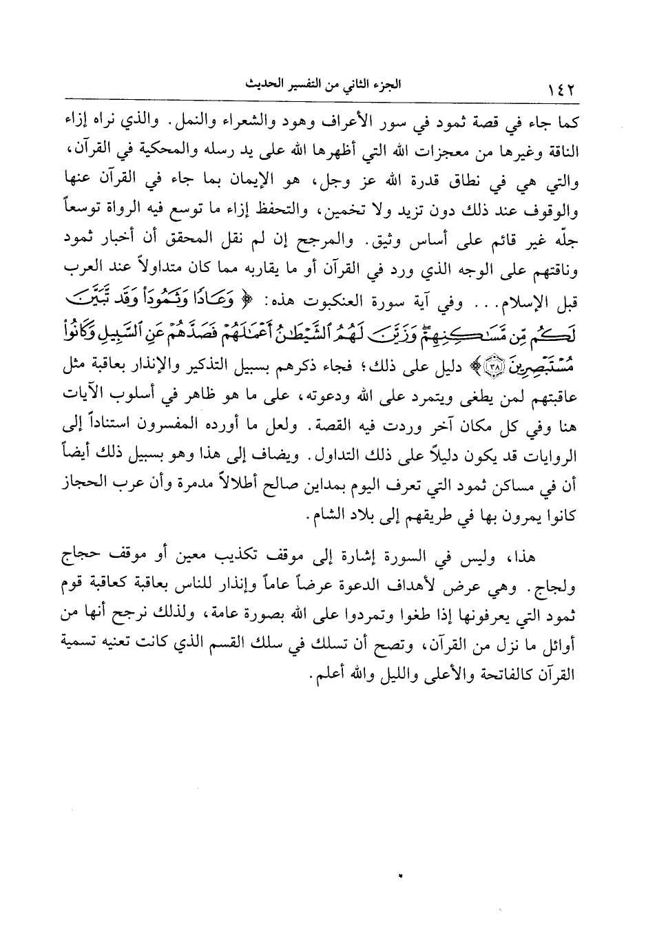 كما جاء في قصة ثمود في سور الأعراف وهود والشعراء والنمل. والذي نراه إزاء الناقة وغيرها من معجزات الله التي أظهرها الله على يد رسله والمحكية في القرآن، والتي هي في نطاق قدرة الله عز وجل، هو الإيمان بما جاء في القرآن عنها والوقوف عند ذلك دون تزيد ولا تخمين، والتحفظ إزاء ما توسع فيه الرواة توسعا جلّه غير قائم على أساس وثيق. والمرجح إن لم نقل المحقق أن أخبار ثمود وناقتهم على الوجه الذي ورد في القرآن أو ما يقاربه مما كان متداولا عند العرب قبل الإسلام ... وفي آية سورة العنكبوت هذه: وَعاداً وَثَمُودَ وَقَدْ تَبَيَّنَ لَكُمْ مِنْ مَساكِنِهِمْ وَزَيَّنَ لَهُمُ الشَّيْطانُ أَعْمالَهُمْ فَصَدَّهُمْ عَنِ السَّبِيلِ وَكانُوا مُسْتَبْصِرِينَ (38) دليل على ذلك فجاء ذكرهم بسبيل التذكير والإنذار بعاقبة مثل عاقبتهم لمن يطغى ويتمرد على الله ودعوته، على ما هو ظاهر في أسلوب الآيات هنا وفي كل مكان آخر وردت فيه القصة. ولعل ما أورده المفسرون استنادا إلى الروايات قد يكون دليلا على ذلك التداول. ويضاف إلى هذا وهو بسبيل ذلك أيضا أن في مساكن ثمود التي تعرف اليوم بمداين صالح أطلالا مدمرة وأن عرب الحجاز كانوا يمرون بها في طريقهم إلى بلاد الشام.