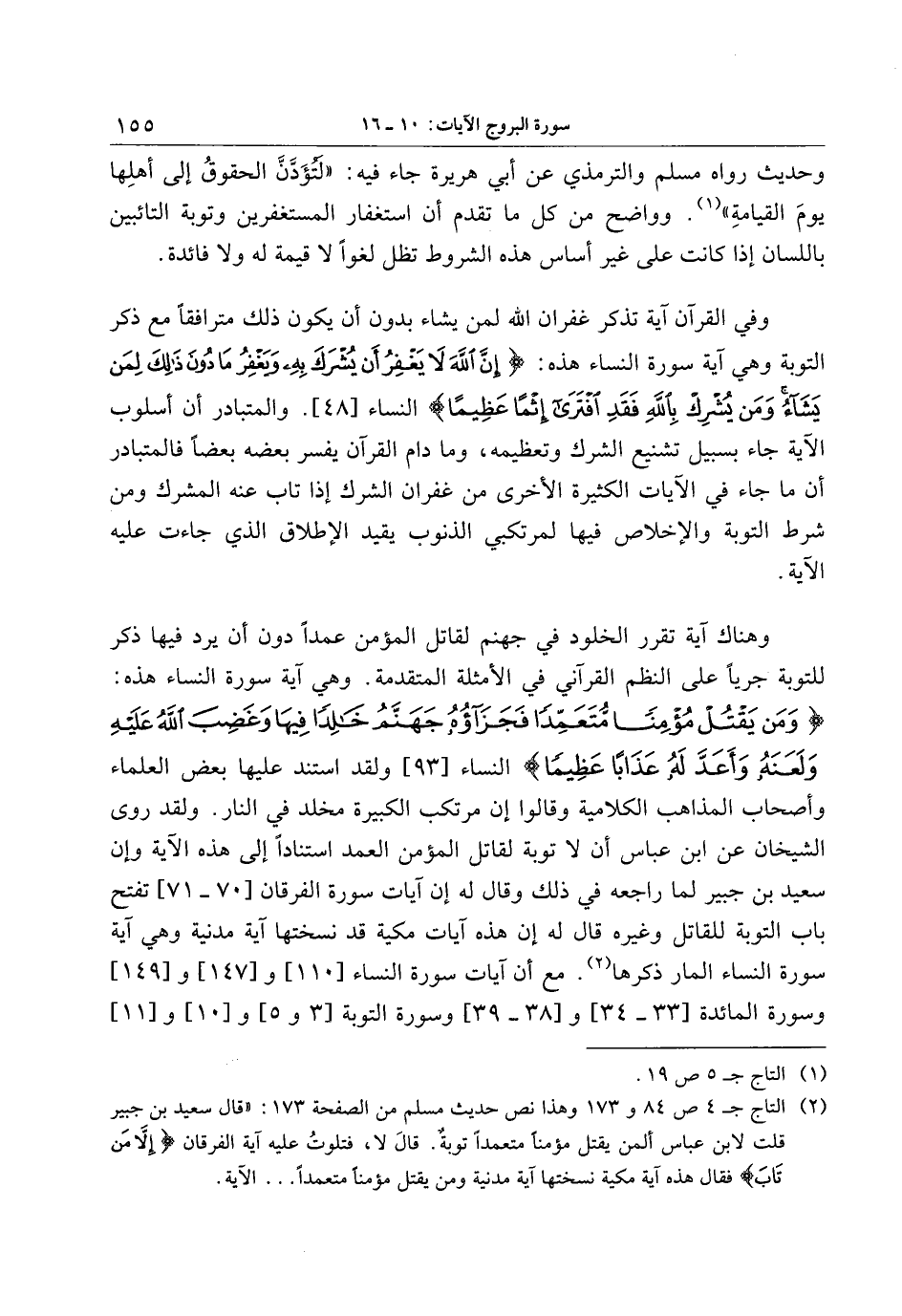 (2) التاج ج 4 ص 84 و 173 وهذا نص حديث مسلم من الصفحة 173: «قال سعيد بن جبير قلت لابن عباس ألمن يقتل مؤمنا متعمدا توبة. قال لا، فتلوت عليه آية الفرقان إِلَّا مَنْ تابَ فقال هذه آية مكية نسختها آية مدنية ومن يقتل مؤمنا متعمدا ... الآية.