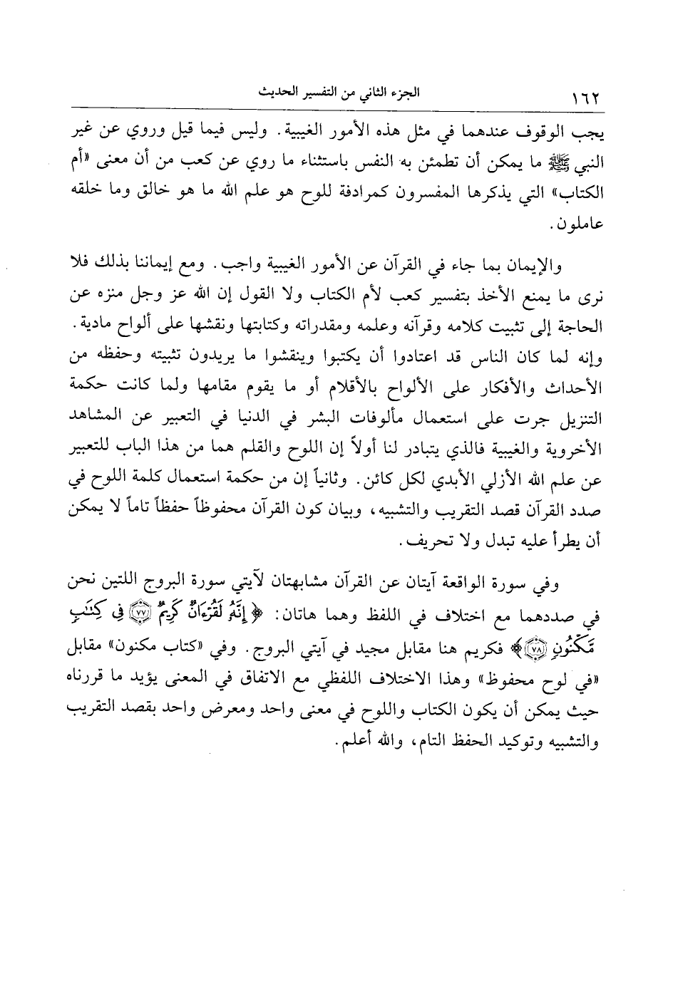 وفي سورة الواقعة آيتان عن القرآن مشابهتان لآيتي سورة البروج اللتين نحن في صددهما مع اختلاف في اللفظ وهما هاتان: إِنَّهُ لَقُرْآنٌ كَرِيمٌ (77) فِي كِتابٍ مَكْنُونٍ (78) فكريم هنا مقابل مجيد في آيتي البروج. وفي «كتاب مكنون» مقابل «في لوح محفوظ» وهذا الاختلاف اللفظي مع الاتفاق في المعنى يؤيد ما قررناه حيث يمكن أن يكون الكتاب واللوح في معنى واحد ومعرض واحد بقصد التقريب والتشبيه وتوكيد الحفظ التام، والله أعلم.