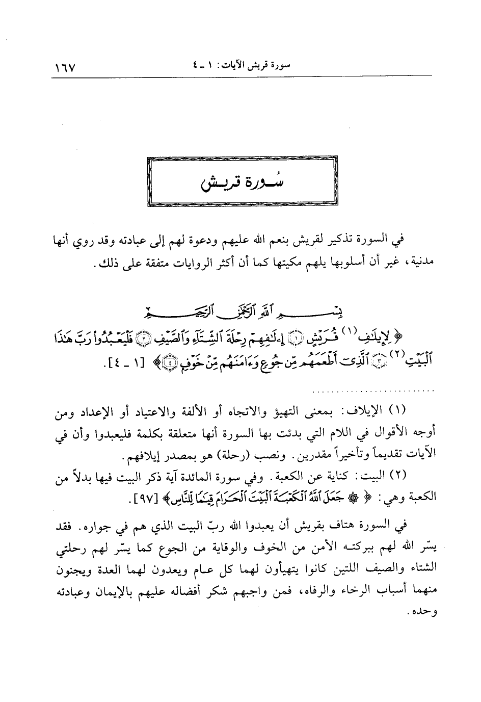 . (1) الإيلاف: بمعنى التهيؤ والاتجاه أو الألفة والاعتياد أو الإعداد ومن أوجه الأقوال في اللام التي بدئت بها السورة أنها متعلقة بكلمة فليعبدوا وأن في الآيات تقديما وتأخيرا مقدرين. ونصب (رحلة) هو بمصدر إيلافهم.
