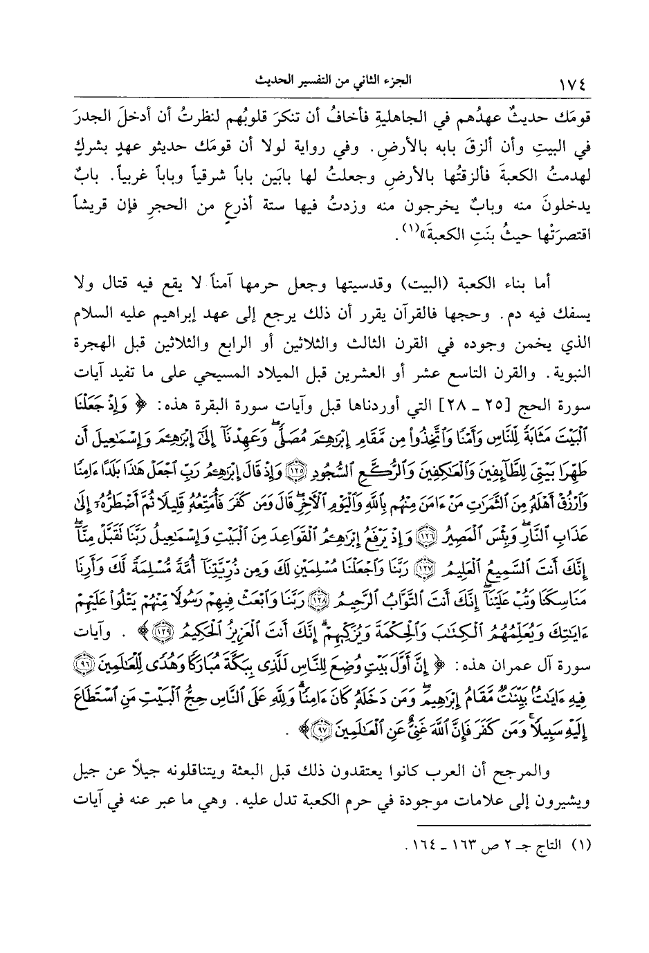 أما بناء الكعبة (البيت) وقدسيتها وجعل حرمها آمنا لا يقع فيه قتال ولا يسفك فيه دم. وحجها فالقرآن يقرر أن ذلك يرجع إلى عهد إبراهيم عليه السلام الذي يخمن وجوده في القرن الثالث والثلاثين أو الرابع والثلاثين قبل الهجرة النبوية. والقرن التاسع عشر أو العشرين قبل الميلاد المسيحي على ما تفيد آيات سورة الحج [25- 28] التي أوردناها قبل وآيات سورة البقرة هذه: وَإِذْ جَعَلْنَا الْبَيْتَ مَثابَةً لِلنَّاسِ وَأَمْناً وَاتَّخِذُوا مِنْ مَقامِ إِبْراهِيمَ مُصَلًّى وَعَهِدْنا إِلى إِبْراهِيمَ وَإِسْماعِيلَ أَنْ طَهِّرا بَيْتِيَ لِلطَّائِفِينَ وَالْعاكِفِينَ وَالرُّكَّعِ السُّجُودِ (125) وَإِذْ قالَ إِبْراهِيمُ رَبِّ اجْعَلْ هذا بَلَداً آمِناً وَارْزُقْ أَهْلَهُ مِنَ الثَّمَراتِ مَنْ آمَنَ مِنْهُمْ بِاللَّهِ وَالْيَوْمِ الْآخِرِ قالَ وَمَنْ كَفَرَ فَأُمَتِّعُهُ قَلِيلًا ثُمَّ أَضْطَرُّهُ إِلى عَذابِ النَّارِ وَبِئْسَ الْمَصِيرُ (126) وَإِذْ يَرْفَعُ إِبْراهِيمُ الْقَواعِدَ مِنَ الْبَيْتِ وَإِسْماعِيلُ رَبَّنا تَقَبَّلْ مِنَّا إِنَّكَ أَنْتَ السَّمِيعُ الْعَلِيمُ (127) رَبَّنا وَاجْعَلْنا مُسْلِمَيْنِ لَكَ وَمِنْ ذُرِّيَّتِنا أُمَّةً مُسْلِمَةً لَكَ وَأَرِنا مَناسِكَنا وَتُبْ عَلَيْنا إِنَّكَ أَنْتَ التَّوَّابُ الرَّحِيمُ (128) رَبَّنا وَابْعَثْ فِيهِمْ رَسُولًا مِنْهُمْ يَتْلُوا عَلَيْهِمْ آياتِكَ وَيُعَلِّمُهُمُ الْكِتابَ وَالْحِكْمَةَ وَيُزَكِّيهِمْ إِنَّكَ أَنْتَ الْعَزِيزُ الْحَكِيمُ (129) . وآيات سورة آل عمران هذه: إِنَّ أَوَّلَ بَيْتٍ وُضِعَ لِلنَّاسِ لَلَّذِي بِبَكَّةَ مُبارَكاً وَهُدىً لِلْعالَمِينَ (96) فِيهِ آياتٌ بَيِّناتٌ مَقامُ إِبْراهِيمَ وَمَنْ دَخَلَهُ كانَ آمِناً وَلِلَّهِ عَلَى النَّاسِ حِجُّ الْبَيْتِ مَنِ اسْتَطاعَ إِلَيْهِ سَبِيلًا وَمَنْ كَفَرَ فَإِنَّ اللَّهَ غَنِيٌّ عَنِ الْعالَمِينَ (97) .