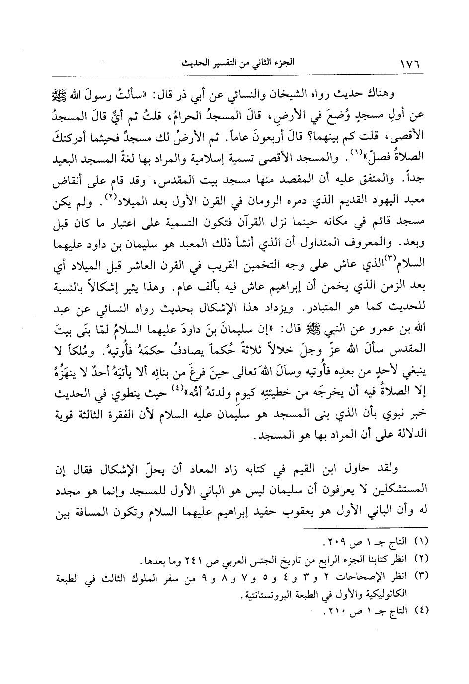 وهناك حديث رواه الشيخان والنسائي عن أبي ذر قال: «سألت رسول الله صلّى الله عليه وسلّم عن أول مسجد وضع في الأرض، قال المسجد الحرام، قلت ثم أيّ قال المسجد الأقصى، قلت كم بينهما؟ قال أربعون عاما. ثم الأرض لك مسجد فحيثما أدركتك الصلاة فصلّ» «1» . والمسجد الأقصى تسمية إسلامية والمراد بها لغة المسجد البعيد جدا. والمتفق عليه أن المقصد منها مسجد بيت المقدس، وقد قام على أنقاض معبد اليهود القديم الذي دمره الرومان في القرن الأول بعد الميلاد «2» . ولم يكن مسجد قائم في مكانه حينما نزل القرآن فتكون التسمية على اعتبار ما كان قبل وبعد. والمعروف المتداول أن الذي أنشأ ذلك المعبد هو سليمان بن داود عليهما السلام «3» الذي عاش على وجه التخمين القريب في القرن العاشر قبل الميلاد أي بعد الزمن الذي يخمن أن إبراهيم عاش فيه بألف عام. وهذا يثير إشكالا بالنسبة للحديث كما هو المتبادر. ويزداد هذا الإشكال بحديث رواه النسائي عن عبد الله بن عمرو عن النبي صلّى الله عليه وسلّم قال: «إن سليمان بن داود عليهما السلام لمّا بنى بيت المقدس سأل الله عزّ وجلّ خلالا ثلاثة حكما يصادف حكمه فأوتيه. وملكا لا ينبغي لأحد من بعده فأوتيه وسأل الله تعالى حين فرغ من بنائه ألا يأتيه أحد لا ينهزه إلا الصلاة فيه أن يخرجه من خطيئته كيوم ولدته أمّه» «4» حيث ينطوي في الحديث خبر نبوي بأن الذي بنى المسجد هو سليمان عليه السلام لأن الفقرة الثالثة قوية الدلالة على أن المراد بها هو المسجد.