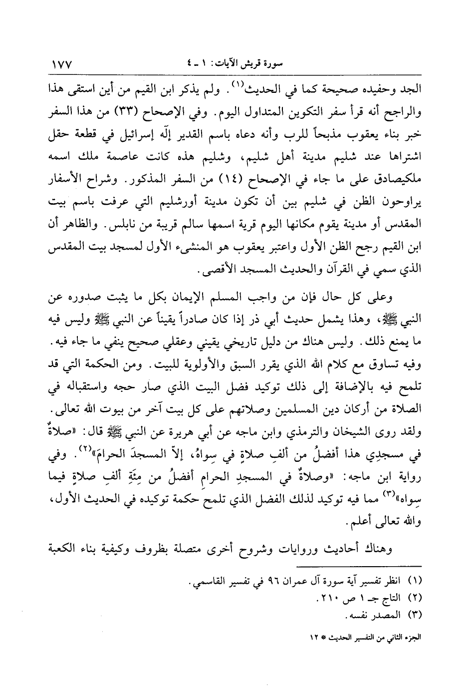 الجد وحفيده صحيحة كما في الحديث «1» . ولم يذكر ابن القيم من أين استقى هذا والراجح أنه قرأ سفر التكوين المتداول اليوم. وفي الإصحاح (33) من هذا السفر خبر بناء يعقوب مذبحا للرب وأنه دعاه باسم القدير إله إسرائيل في قطعة حقل اشتراها عند شليم مدينة أهل شليم، وشليم هذه كانت عاصمة ملك اسمه ملكيصادق على ما جاء في الإصحاح (14) من السفر المذكور. وشراح الأسفار يراوحون الظن في شليم بين أن تكون مدينة أورشليم التي عرفت باسم بيت المقدس أو مدينة يقوم مكانها اليوم قرية اسمها سالم قريبة من نابلس. والظاهر أن ابن القيم رجح الظن الأول واعتبر يعقوب هو المنشئ الأول لمسجد بيت المقدس الذي سمي في القرآن والحديث المسجد الأقصى.