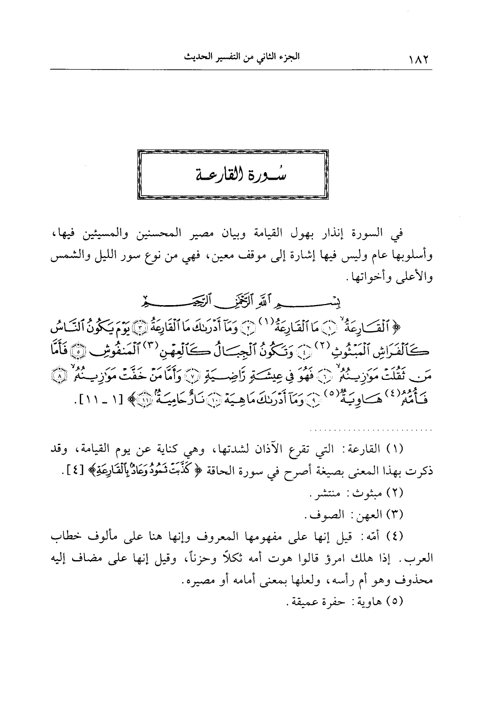 . (1) القارعة: التي تقرع الآذان لشدتها، وهي كناية عن يوم القيامة، وقد ذكرت بهذا المعنى بصيغة أصرح في سورة الحاقة كَذَّبَتْ ثَمُودُ وَعادٌ بِالْقارِعَةِ [4] .