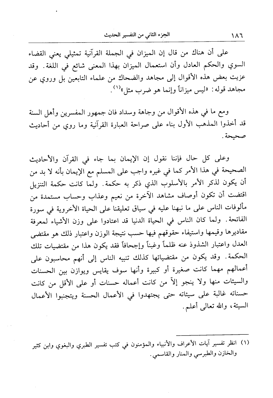 وعلى كل حال فإننا نقول إن الإيمان بما جاء في القرآن والأحاديث الصحيحة في هذا الأمر كما في غيره واجب على المسلم مع الإيمان بأنه لا بد من أن يكون لذكر الأمر بالأسلوب الذي ذكر به حكمة. ولما كانت حكمة التنزيل اقتضت أن تكون أوصاف مشاهد الآخرة من نعيم وعذاب وحساب مستمدة من مألوفات الناس على ما نبهنا عليه في سياق تعليقنا على الحياة الأخروية في سورة الفاتحة. ولما كان الناس في الحياة الدنيا قد اعتادوا على وزن الأشياء لمعرفة مقاديرها وقيمها واستيفاء حقوقهم فيها حسب نتيجة الوزن واعتبار ذلك هو مقتضى العدل واعتبار الشذوذ عنه ظلما وغبنا وإجحافا فقد يكون هذا من مقتضيات تلك الحكمة. وقد يكون من مقتضياتها كذلك تنبيه الناس إلى أنهم محاسبون على أعمالهم مهما كانت صغيرة أو كبيرة وأنها سوف يقايس ويوازن بين الحسنات والسيئات منها ولا ينجو إلّا من كانت أعماله حسنات أو على الأقل من كانت حسناته غالبة على سيئاته حتى يجتهدوا في الأعمال الحسنة ويتجنبوا الأعمال السيئة، والله تعالى أعلم.