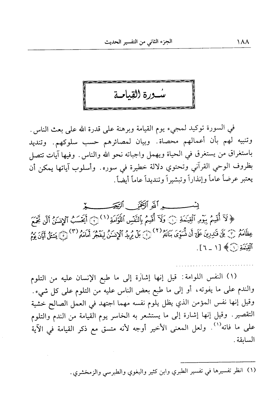 . (1) النفس اللوامة: قيل إنها إشارة إلى ما طبع الإنسان عليه من التلوم والندم على ما يفوته، أو إلى ما طبع بعض الناس عليه من التلوم على كل شيء.