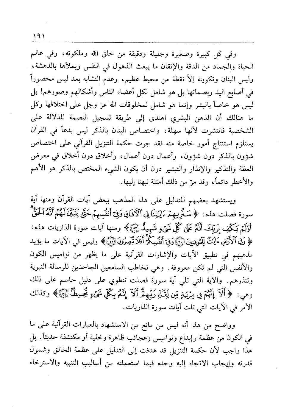 وَفِي الْأَرْضِ آياتٌ لِلْمُوقِنِينَ (20) وَفِي أَنْفُسِكُمْ أَفَلا تُبْصِرُونَ (21) وليس في الآيات ما يؤيد مذهبهم في تطبيق الآيات والإشارات القرآنية على ما يظهر من نواميس الكون والأنفس التي لم تكن معروفة. وهي تخاطب السامعين الجاحدين للرسالة النبوية وتنذرهم. والآية التي تلي آية سورة فصلت تنطوي على دليل حاسم على ذلك وهي: أَلا إِنَّهُمْ فِي مِرْيَةٍ مِنْ لِقاءِ رَبِّهِمْ أَلا إِنَّهُ بِكُلِّ شَيْءٍ مُحِيطٌ (54) وكذلك الأمر في الآيات التي تلت آيات سورة الذاريات.