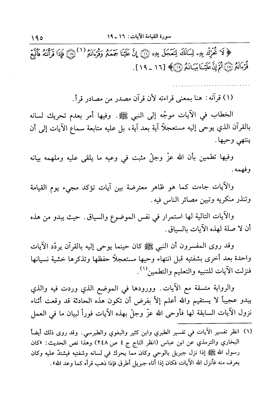 (1) انظر تفسير الآيات في تفسير الطبري وابن كثير والبغوي والطبرسي. وقد روى ذلك أيضا البخاري والترمذي عن ابن عباس (انظر التاج ج 4 ص 248) وهذا نص الحديث: «كان رسول الله صلّى الله عليه وسلّم إذا نزل جبريل بالوحي وكان مما يحرك في لسانه وشفتيه فيشتدّ عليه وكان يعرف منه فأنزل الله الآيات فكان إذا أتاه جبريل أطرق فإذا ذهب قرأه كما وعد الله» .