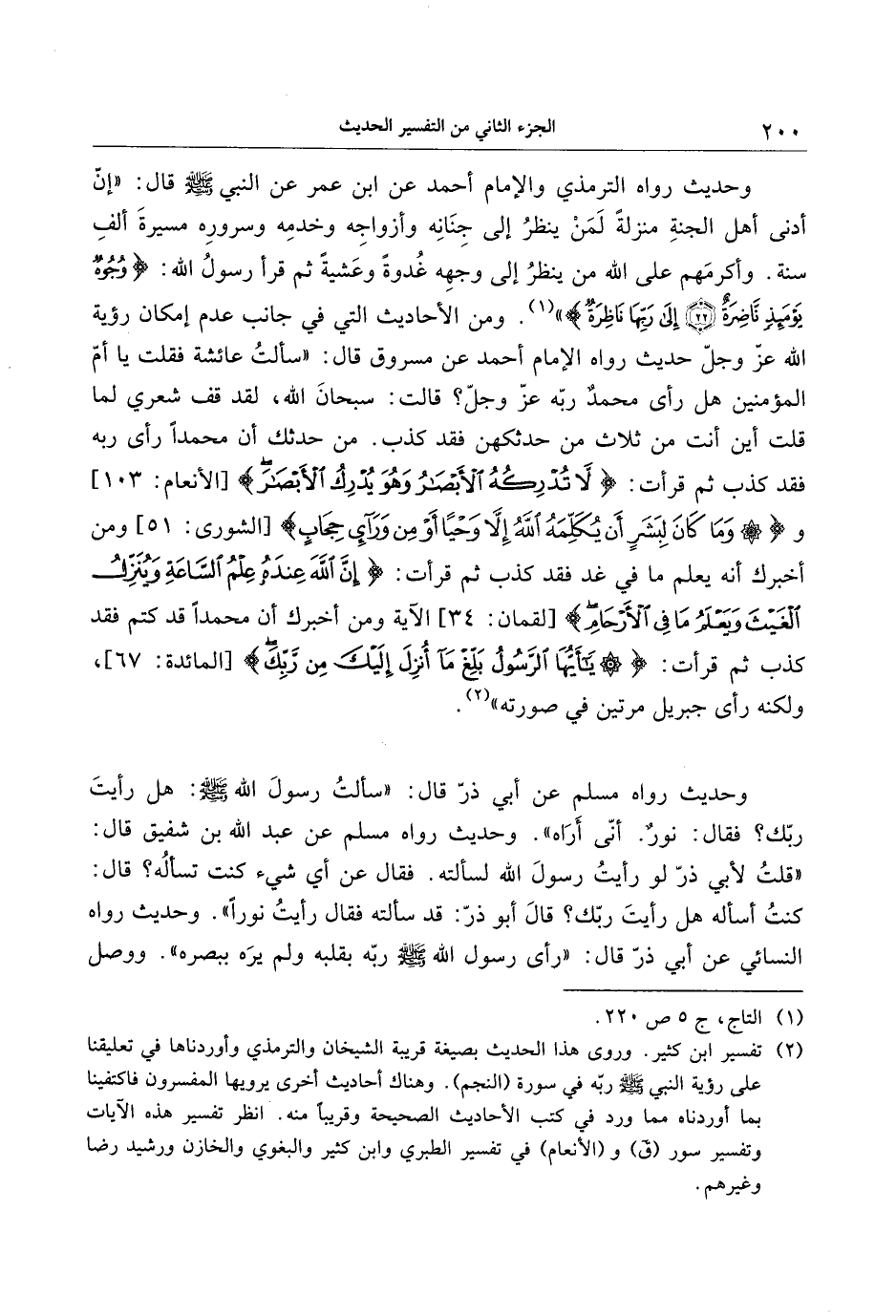 وحديث رواه الترمذي والإمام أحمد عن ابن عمر عن النبي صلى الله عليه وسلّم قال: «إنّ أدنى أهل الجنة منزلة لمن ينظر إلى جنانه وأزواجه وخدمه وسروره مسيرة ألف سنة. وأكرمهم على الله من ينظر إلى وجهه غدوة وعشية ثم قرأ رسول الله: وُجُوهٌ يَوْمَئِذٍ ناضِرَةٌ (22) إِلى رَبِّها ناظِرَةٌ» «1» . ومن الأحاديث التي في جانب عدم إمكان رؤية الله عزّ وجلّ حديث رواه الإمام أحمد عن مسروق قال: «سألت عائشة فقلت يا أمّ المؤمنين هل رأى محمد ربّه عزّ وجلّ؟ قالت: سبحان الله، لقد قف شعري لما قلت أين أنت من ثلاث من حدثكهن فقد كذب. من حدثك أن محمدا رأى ربه فقد كذب ثم قرأت: لا تُدْرِكُهُ الْأَبْصارُ وَهُوَ يُدْرِكُ الْأَبْصارَ [الأنعام: 103] ووَ ما كانَ لِبَشَرٍ أَنْ يُكَلِّمَهُ اللَّهُ إِلَّا وَحْياً أَوْ مِنْ وَراءِ حِجابٍ [الشورى: 51] ومن أخبرك أنه يعلم ما في غد فقد كذب ثم قرأت: إِنَّ اللَّهَ عِنْدَهُ عِلْمُ السَّاعَةِ وَيُنَزِّلُ الْغَيْثَ وَيَعْلَمُ ما فِي الْأَرْحامِ [لقمان: 34] الآية ومن أخبرك أن محمدا قد كتم فقد كذب ثم قرأت: يا أَيُّهَا الرَّسُولُ بَلِّغْ ما أُنْزِلَ إِلَيْكَ مِنْ رَبِّكَ [المائدة: 67] ، ولكنه رأى جبريل مرتين في صورته» «2» .