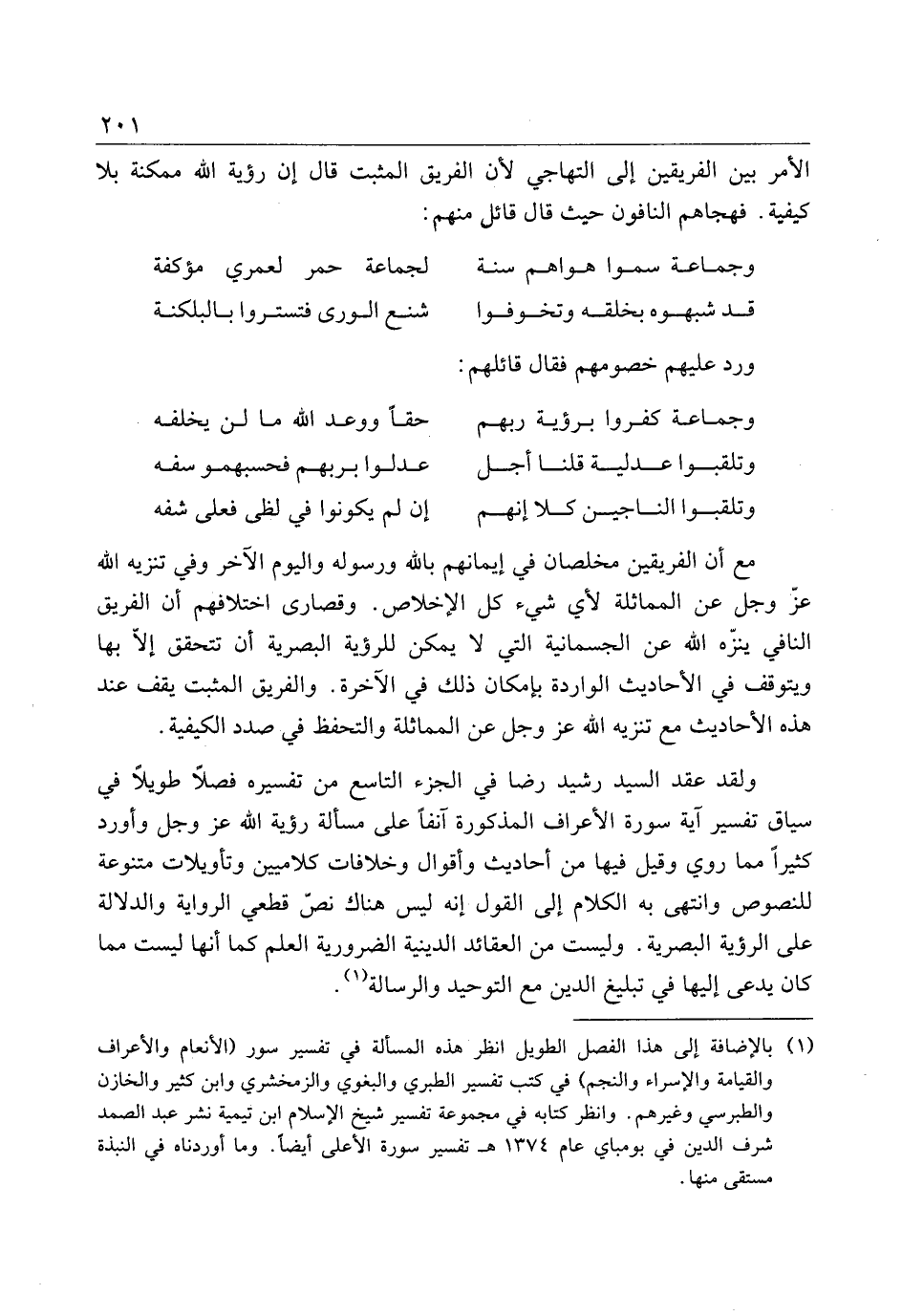 مع أن الفريقين مخلصان في إيمانهم بالله ورسوله واليوم الآخر وفي تنزيه الله عزّ وجل عن المماثلة لأي شيء كل الإخلاص. وقصارى اختلافهم أن الفريق النافي ينزّه الله عن الجسمانية التي لا يمكن للرؤية البصرية أن تتحق إلّا بها ويتوقف في الأحاديث الواردة بإمكان ذلك في الآخرة. والفريق المثبت يقف عند هذه الأحاديث مع تنزيه الله عز وجل عن المماثلة والتحفظ في صدد الكيفية.