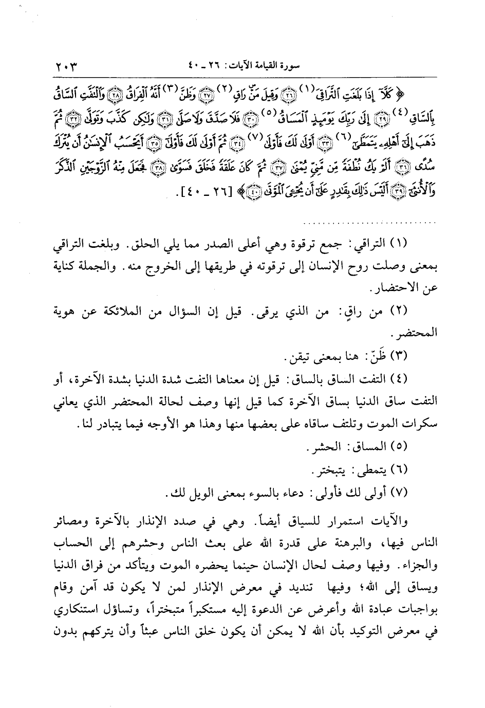 . (1) التراقي: جمع ترقوة وهي أعلى الصدر مما يلي الحلق. وبلغت التراقي بمعنى وصلت روح الإنسان إلى ترقوته في طريقها إلى الخروج منه. والجملة كناية عن الاحتضار.