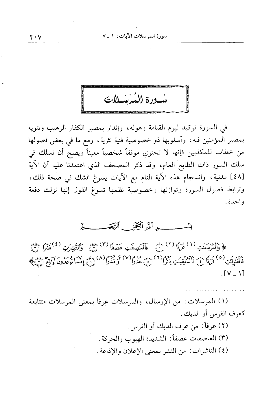 . (1) المرسلات: من الإرسال، والمرسلات عرفا بمعنى المرسلات متتابعة كعرف الفرس أو الديك.