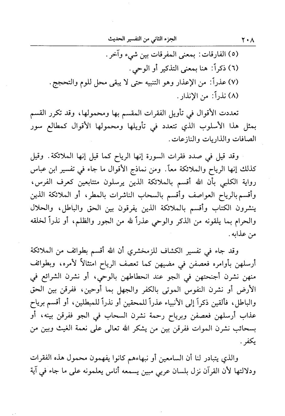وقد جاء في تفسير الكشاف للزمخشري أن الله أقسم بطوائف من الملائكة أرسلهن بأوامره فعصفن في مضيهن كما تعصف الرياح امتثالا لأمره، وبطوائف منهن نشرن أجنحتهن في الجو عند انحطاطهن بالوحي، أو نشرن الشرائع في الأرض أو نشرن النفوس الموتى بالكفر والجهل بما أوحين، ففرقن بين الحق والباطل، فألقين ذكرا إلى الأنبياء عذرا للمحقين أو نذرا للمبطلين، أو أقسم برياح عذاب أرسلهن فعصفن وبرياح رحمة نشرن السحاب في الجو ففرقن بينه، أو بسحائب نشرن الموات ففرقن بين من يشكر الله تعالى على نعمة الغيث وبين من يكفر.