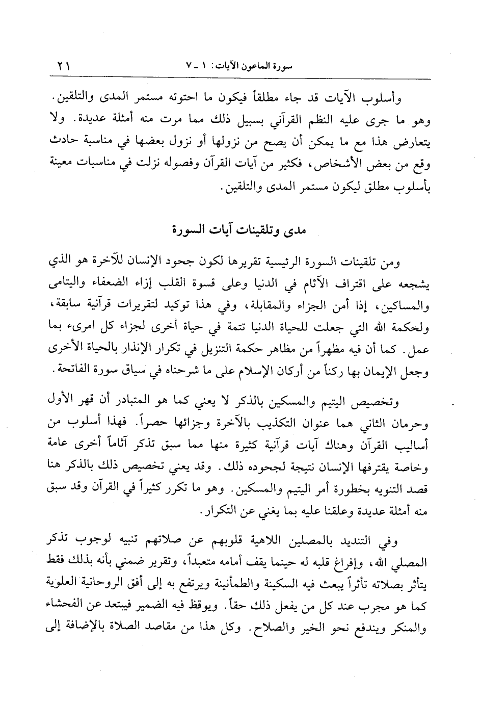 ومن تلقينات السورة الرئيسية تقريرها لكون جحود الإنسان للآخرة هو الذي يشجعه على اقتراف الآثام في الدنيا وعلى قسوة القلب إزاء الضعفاء واليتامى والمساكين، إذا أمن الجزاء والمقابلة، وفي هذا توكيد لتقريرات قرآنية سابقة، ولحكمة الله التي جعلت للحياة الدنيا تتمة في حياة أخرى لجزاء كل امرئ بما عمل. كما أن فيه مظهرا من مظاهر حكمة التنزيل في تكرار الإنذار بالحياة الأخرى وجعل الإيمان بها ركنا من أركان الإسلام على ما شرحناه في سياق سورة الفاتحة.