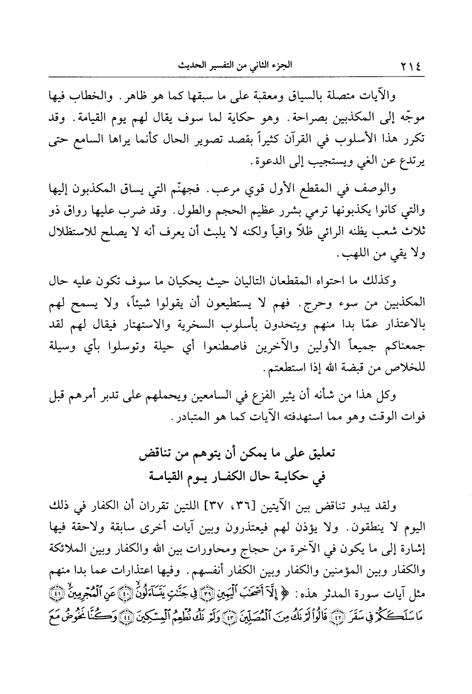 ولقد يبدو تناقض بين الآيتين [36، 37] اللتين تقرران أن الكفار في ذلك اليوم لا ينطقون. ولا يؤذن لهم فيعتذرون وبين آيات أخرى سابقة ولاحقة فيها إشارة إلى ما يكون في الآخرة من حجاج ومحاورات بين الله والكفار وبين الملائكة والكفار وبين المؤمنين والكفار وبين الكفار أنفسهم. وفيها اعتذارات عما بدا منهم مثل آيات سورة المدثر هذه: إِلَّا أَصْحابَ الْيَمِينِ (39) فِي جَنَّاتٍ يَتَساءَلُونَ (40) عَنِ الْمُجْرِمِينَ (41) ما سَلَكَكُمْ فِي سَقَرَ (42) قالُوا لَمْ نَكُ مِنَ الْمُصَلِّينَ (43) وَلَمْ نَكُ نُطْعِمُ الْمِسْكِينَ (44) وَكُنَّا نَخُوضُ مَعَ