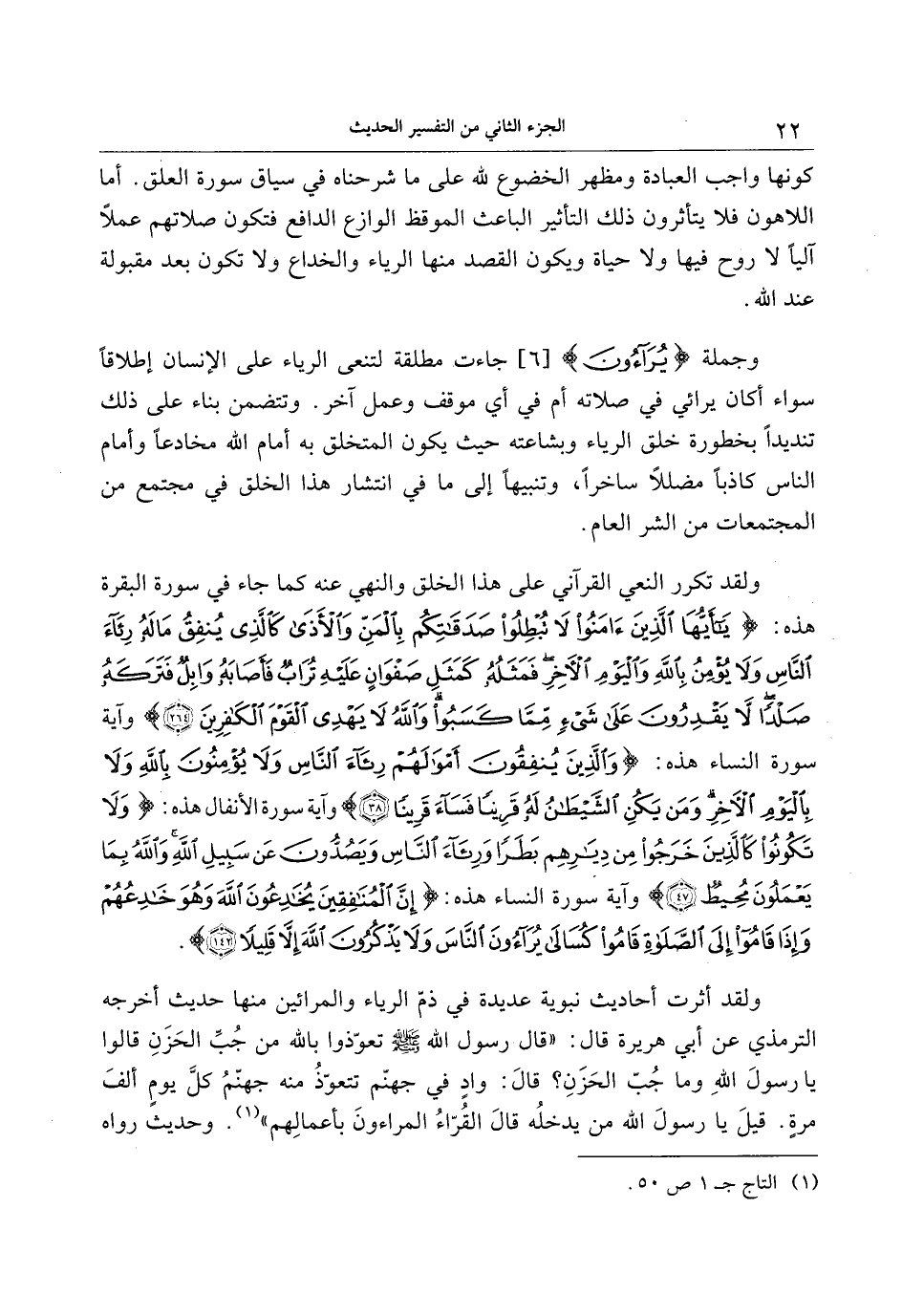 وجملة يُراؤُنَ [6] جاءت مطلقة لتنعى الرياء على الإنسان إطلاقا سواء أكان يرائي في صلاته أم في أي موقف وعمل آخر. وتتضمن بناء على ذلك تنديدا بخطورة خلق الرياء وبشاعته حيث يكون المتخلق به أمام الله مخادعا وأمام الناس كاذبا مضللا ساخرا، وتنبيها إلى ما في انتشار هذا الخلق في مجتمع من المجتمعات من الشر العام.