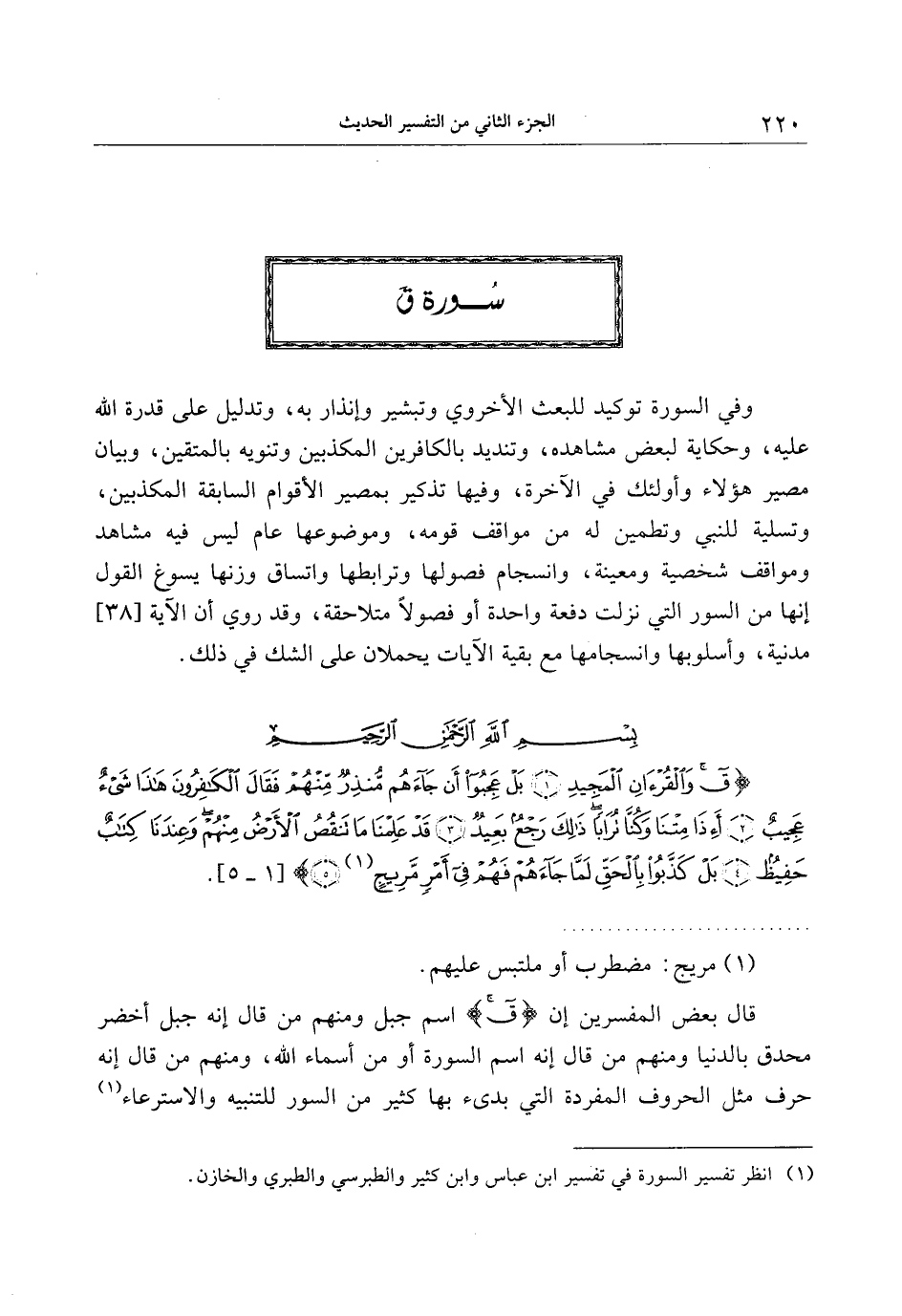 قال بعض المفسرين إن ق اسم جبل ومنهم من قال إنه جبل أخضر محدق بالدنيا ومنهم من قال إنه اسم السورة أو من أسماء الله، ومنهم من قال إنه حرف مثل الحروف المفردة التي بدئ بها كثير من السور للتنبيه والاسترعاء «1»
