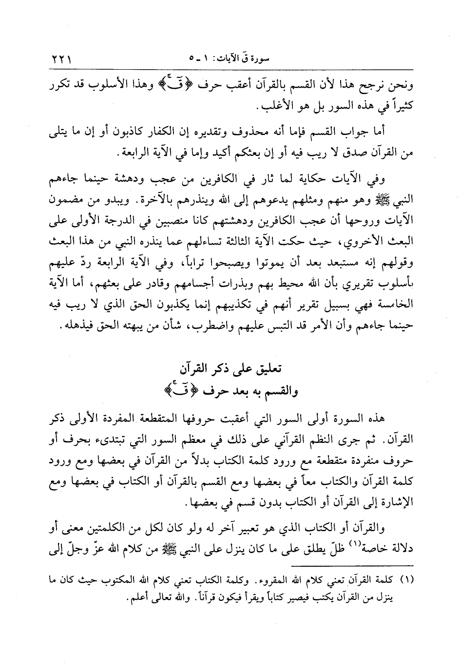 ونحن نرجح هذا لأن القسم بالقرآن أعقب حرف ق وهذا الأسلوب قد تكرر كثيرا في هذه السور بل هو الأغلب.