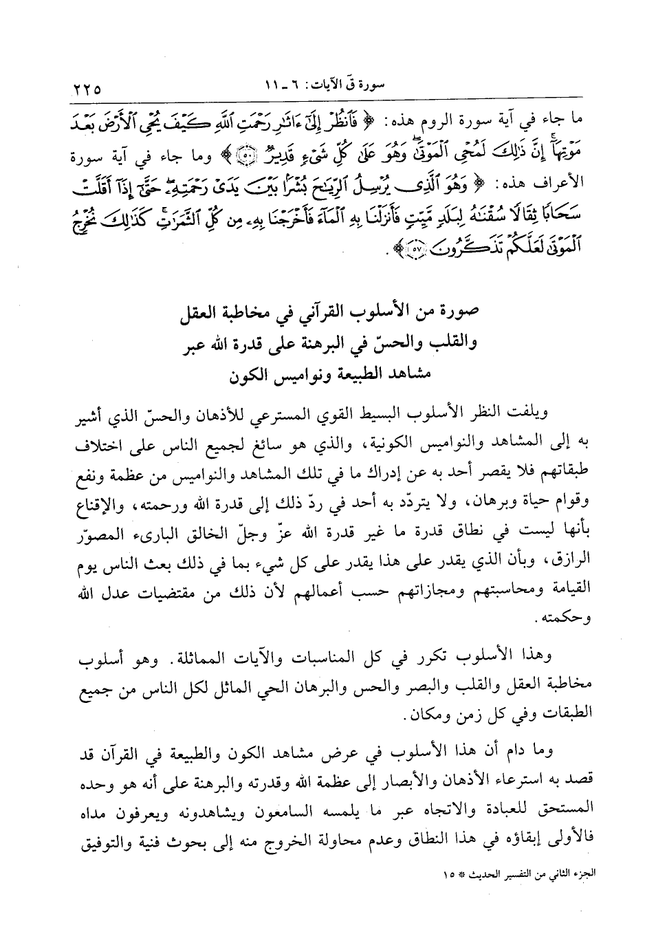 وما دام أن هذا الأسلوب في عرض مشاهد الكون والطبيعة في القرآن قد قصد به استرعاء الأذهان والأبصار إلى عظمة الله وقدرته والبرهنة على أنه هو وحده المستحق للعبادة والاتجاه عبر ما يلمسه السامعون ويشاهدونه ويعرفون مداه فالأولى إبقاؤه في هذا النطاق وعدم محاولة الخروج منه إلى بحوث فنية والتوفيق الجزء الثاني من التفسير الحديث 15