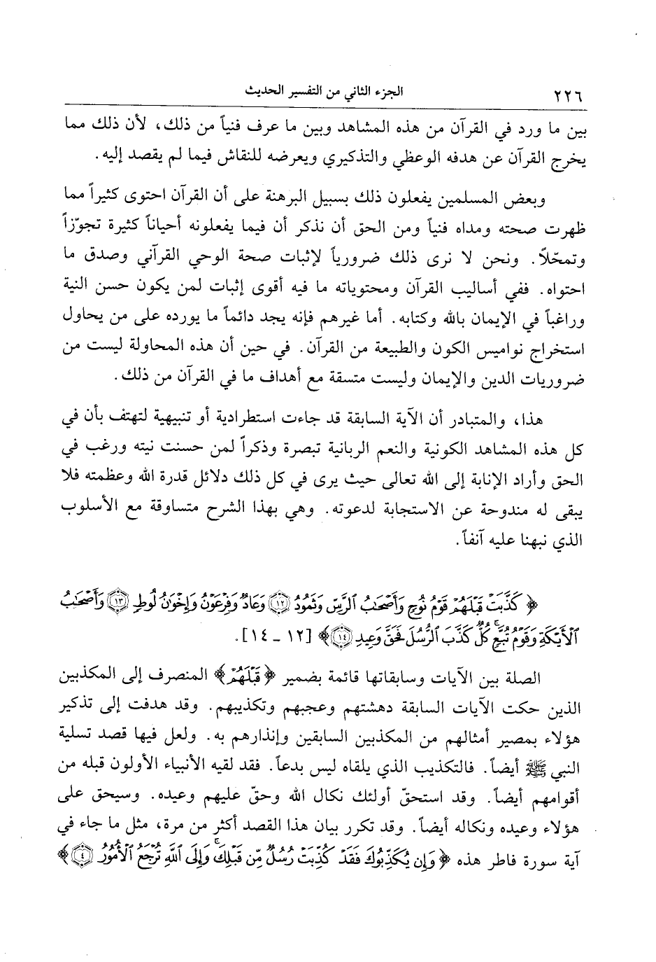 وبعض المسلمين يفعلون ذلك بسبيل البرهنة على أن القرآن احتوى كثيرا مما ظهرت صحته ومداه فنيا ومن الحق أن نذكر أن فيما يفعلونه أحيانا كثيرة تجوّزا وتمحّلا. ونحن لا نرى ذلك ضروريا لإثبات صحة الوحي القرآني وصدق ما احتواه. ففي أساليب القرآن ومحتوياته ما فيه أقوى إثبات لمن يكون حسن النية وراغبا في الإيمان بالله وكتابه. أما غيرهم فإنه يجد دائما ما يورده على من يحاول استخراج نواميس الكون والطبيعة من القرآن. في حين أن هذه المحاولة ليست من ضروريات الدين والإيمان وليست متسقة مع أهداف ما في القرآن من ذلك.